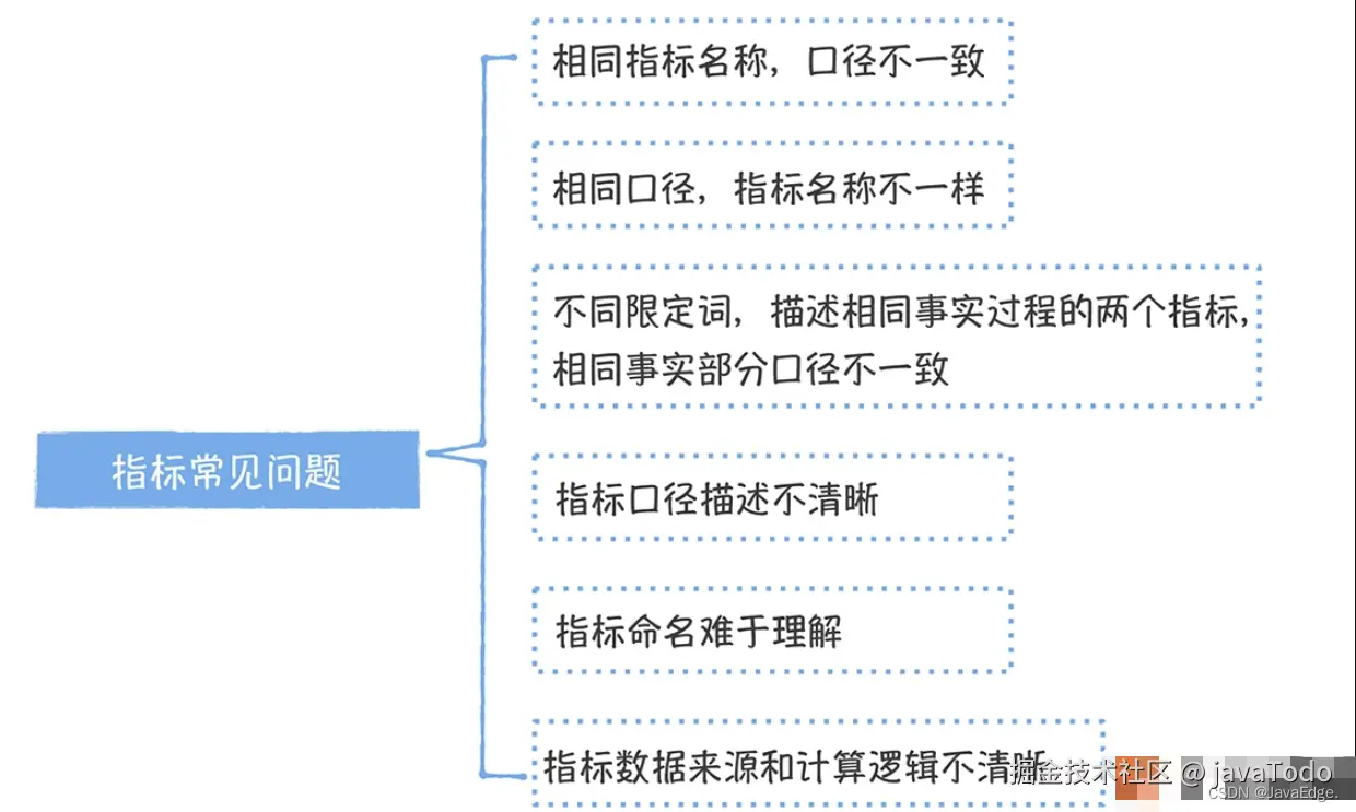 - 不同的两个指标描述的相同业务过程中的相同事实部分口径不一致,是指标梳理过程中最常见的问题,需要通过拆分原子指标和派生指标的方式解决。
