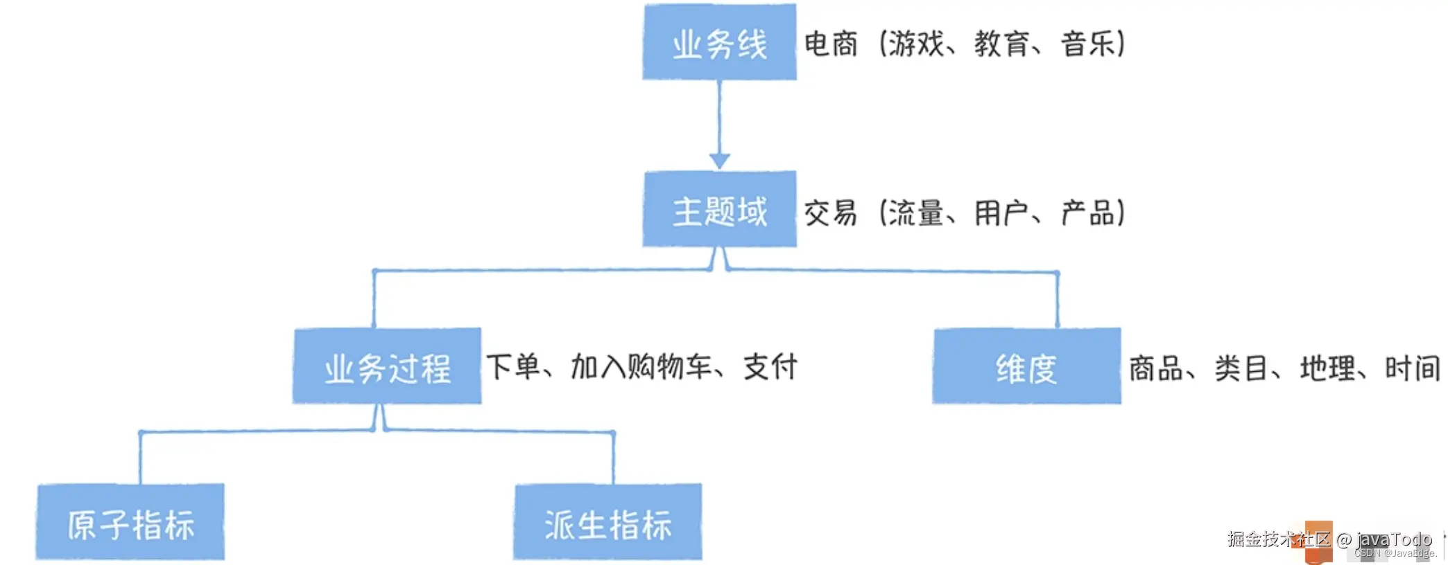 电商、游戏、音乐、传媒、教育是不同业务线。业务线之下是主题域,指标中的主题域与数仓中的概念是一致的,划分标准最好是跟数仓保持一致(数仓主题域的划分,我会在06讲详细讲述)。在主题域下面还有细分的业务过程,比如对于交易域,细分的业务过程有加入购物车、下单、支付。