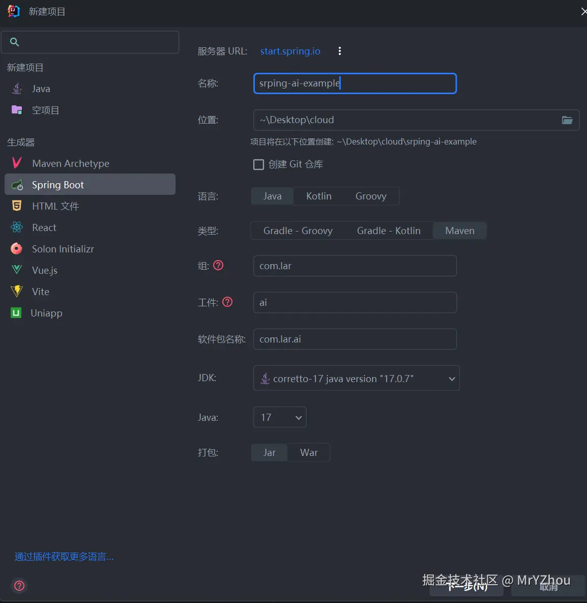 1.先创建springboot项目,注意jdk17起步,因为 Spring AI Alibaba 基于 Spring Boot 3.x 开发,而springboot3要求jdk最低版本17。