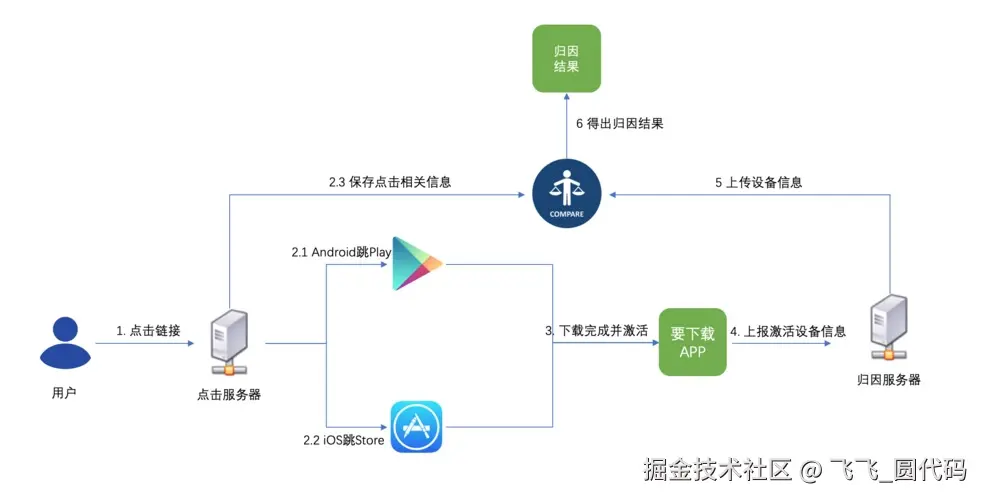 - 服务器将第 1 步接收到的设备信息与第 4 步发过来的设备信息进行对比,如果能匹配得上,则表明这次安装时由对应渠道链接引导安装的,如果匹配不到,则默认为是自然流量安装。