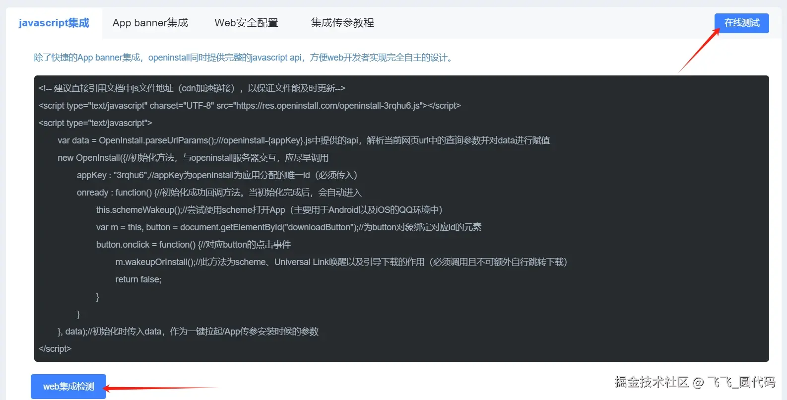 经过在线测试确认 sdk 集成正确的情况下, 开发人员可以开始在 web 分享页/渠道页上集成 openinstall web api,同样只需简单的复制粘贴即可。