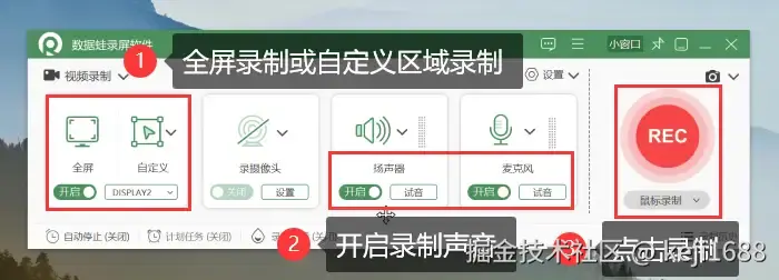 步骤2:在 【视频录制】 模式中,自由调整录制的区域、声音、摄像头等内容,设置完成后点击【REC】按钮进行录制。