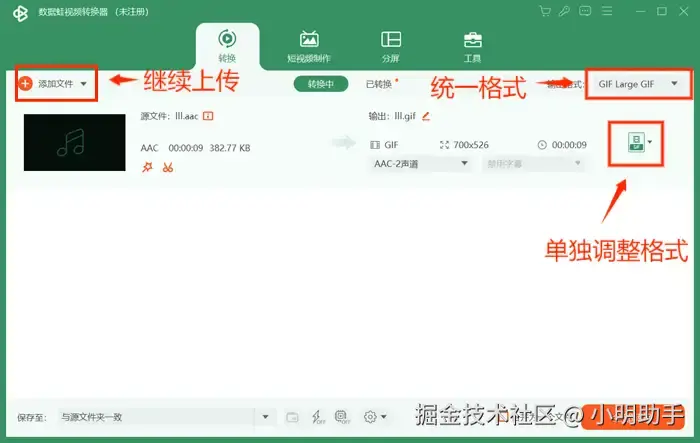 第三步:可点击【添加文件】按钮继续上传文件,进行音频文件批量转换。上传好文件之后,点击右上方【输出格式】旁边的长框进行统一格式的设置或者点击界面右侧的绿色图标进行单个文件的格式设置。