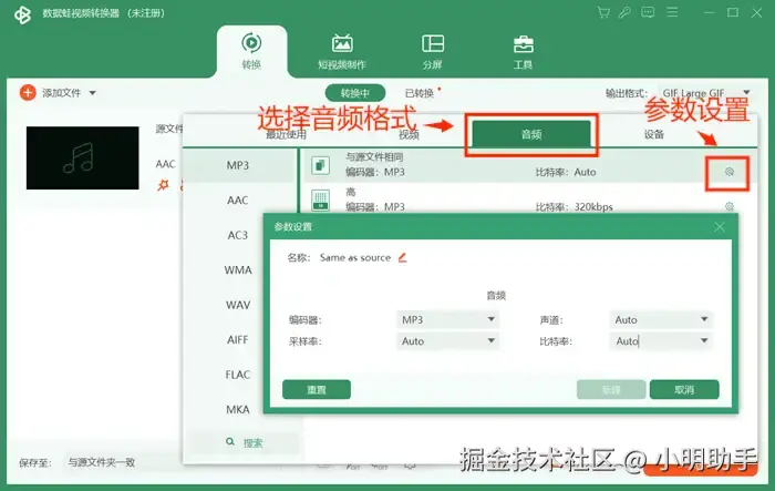 第四步:进入输出格式设置界面后,点击【音频】,在左侧的音频格式列表中选择自己需要的格式。如果有需要的话,可以点击右侧小齿轮按钮进行【比特率】等参数设置。
