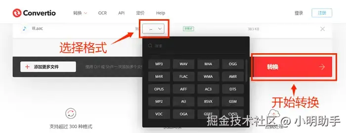 第四步:点击中间的【···】按钮选择自己需要的输出格式,然后点击【转换】按钮开始转换音频文件,等待转换完成之后,点击【下载】按钮将转换后的音频文件保存到电脑上。