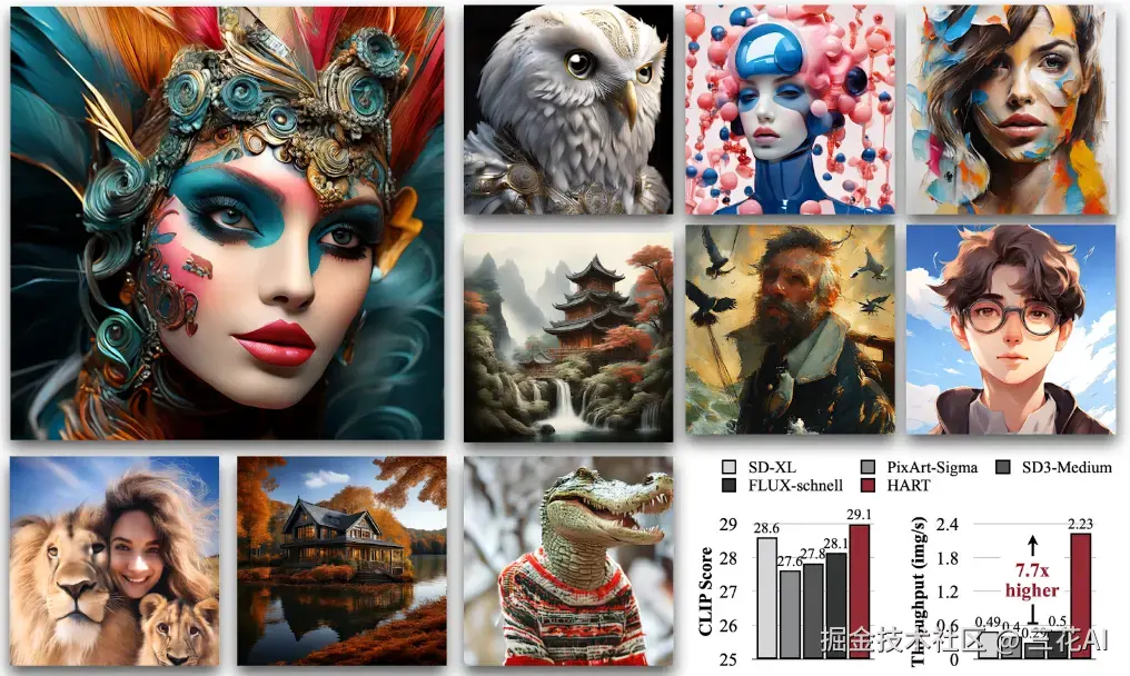 HART 是英伟达推出的自回归(AR)图像生成模型,能够生成 1024x1024 的高质量图像,其生成速度比扩散模型快 4.5 至 7.7 倍。与 SDXL 相比,HART 在所有基准测试中表现更佳,速度更快。我挺看好这个模型的,速度实在太快了,你们可以在线试用感受一下。