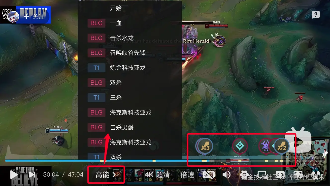 通过对LOL赛事直播中关键事件的自动识别和分析,B站在游戏识别技术方面取得了显著的提升。我们的技术涵盖了从文字识别、目标检测到多模态信息融合等多个领域,构建了一条完备的高能打点和互动呈现的技术链路。观众现在可以通过进度条上的高能点直观地回顾赛事中的精彩瞬间,也可以访问热区查看实时赛事数据,这种互动式的观赛模式极大地增强了观众的参与感和对赛事的关注度。