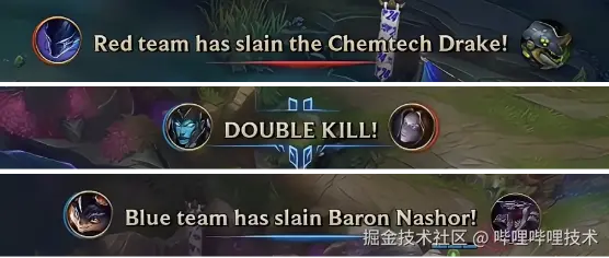 图6 中间区域的事件播报:从上到下分别为击杀炼金龙,双杀,击杀男爵