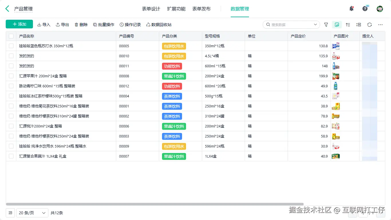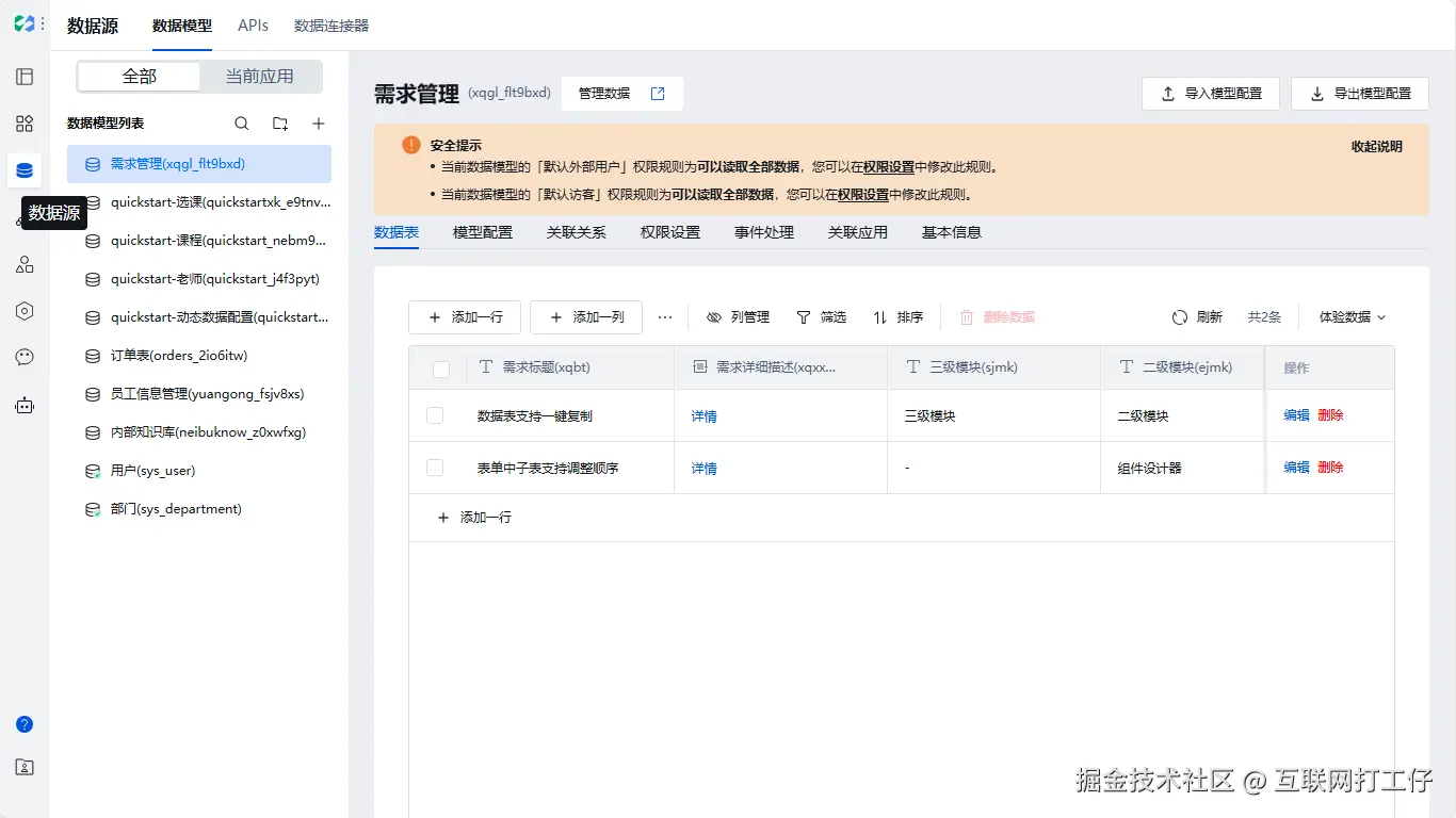 - 数据管理页面:数据管理页面主要功能包括:数据展示、筛选、新增、编辑、详情、导入、导出等功能。用户只需要选择一个数据表就可以自动生成数据管理页面,极大地提升了用户开发效率。数据管理页面是基于标准页面做的二次封装,若数据管理页面功能不满足需求,可以转成标准页面,再做设计调整。