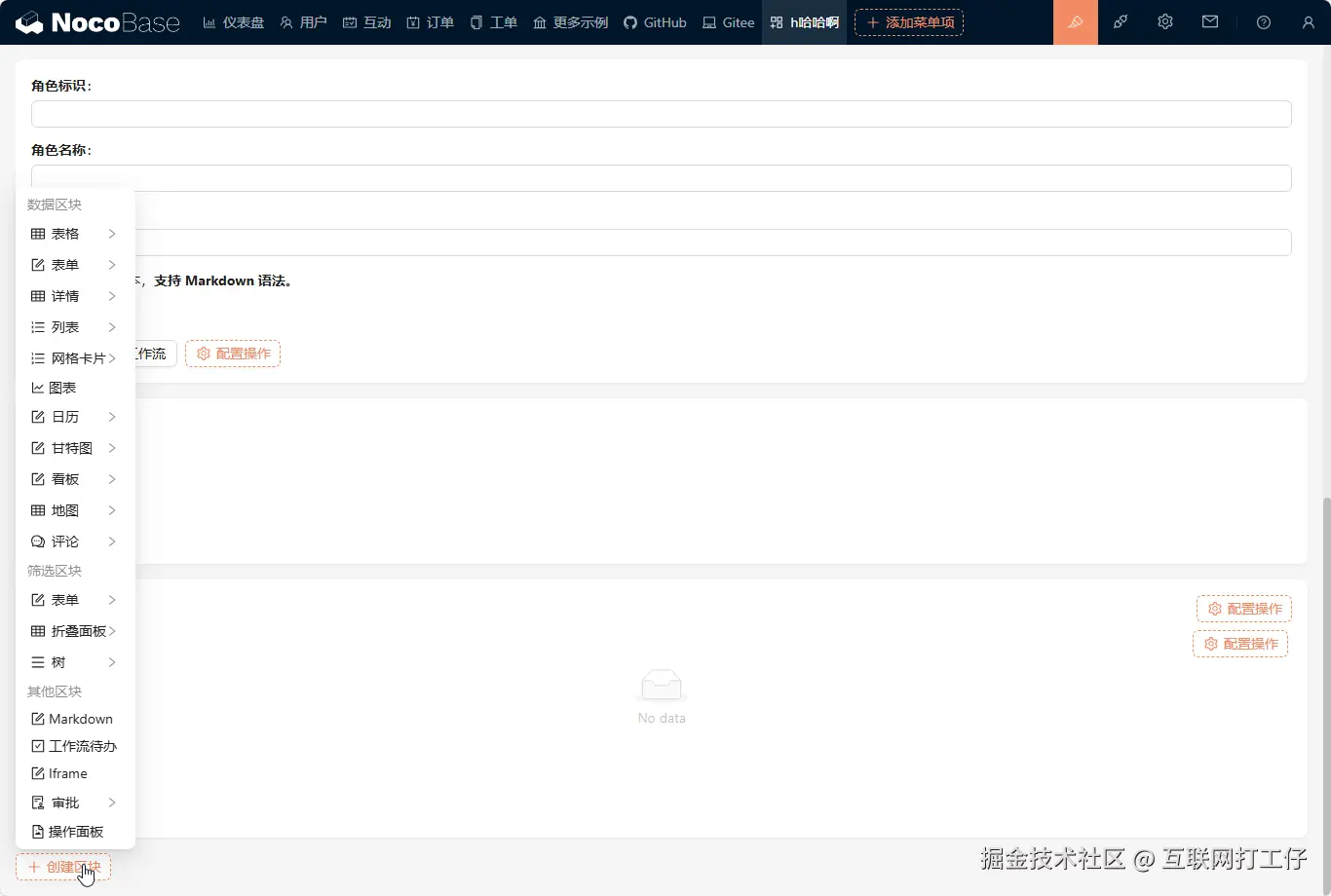 NocoBase 的页面都是由组件构成的,每种类型的组件封装程度高,以表格组件为例,常用导入、导出、删除等功能直接配置即可。提供的组件库比较丰富,也支持用户自行扩展。但是组件之间联动能力较弱,页面设计的交互有较大的提升空间,有些配置页面设计不够友好,理解成本较高。