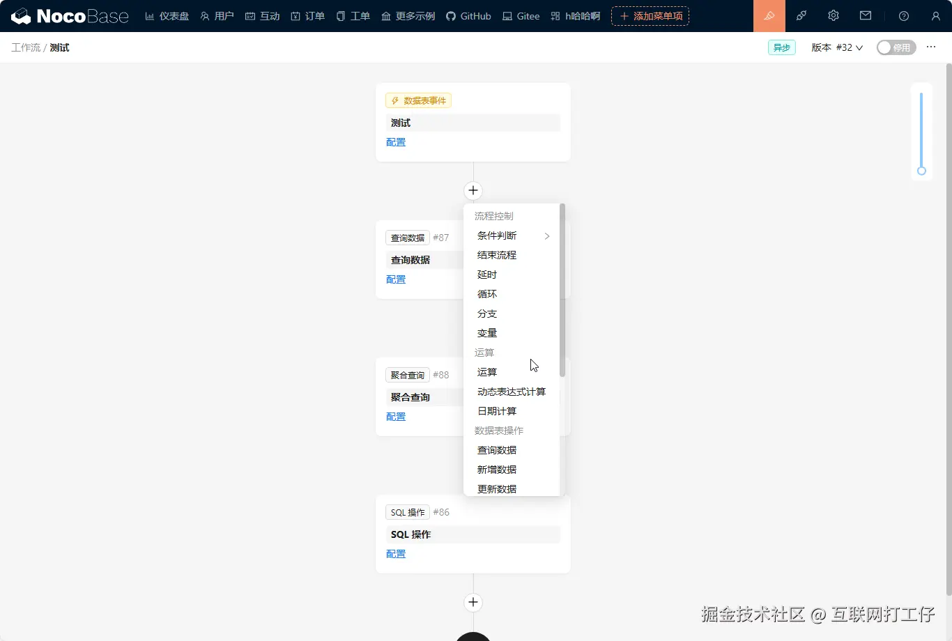 在工作流中支持条件判断、循环等逻辑,支持调用数据表模型的新增/更新/删除/聚合/汇总统计等方法,支持调用第三方接口或者自己编写的 SQL 语句。