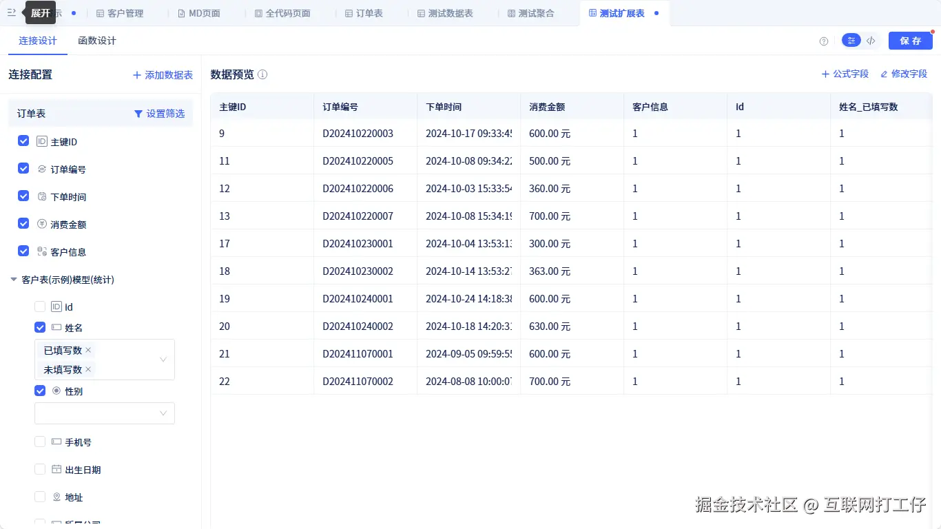 3、扩展表模型:对多张数据表建立关联关系,支持对连接表的字段进行统计求和,在表单等组件中可以一次性操作多张表数据。