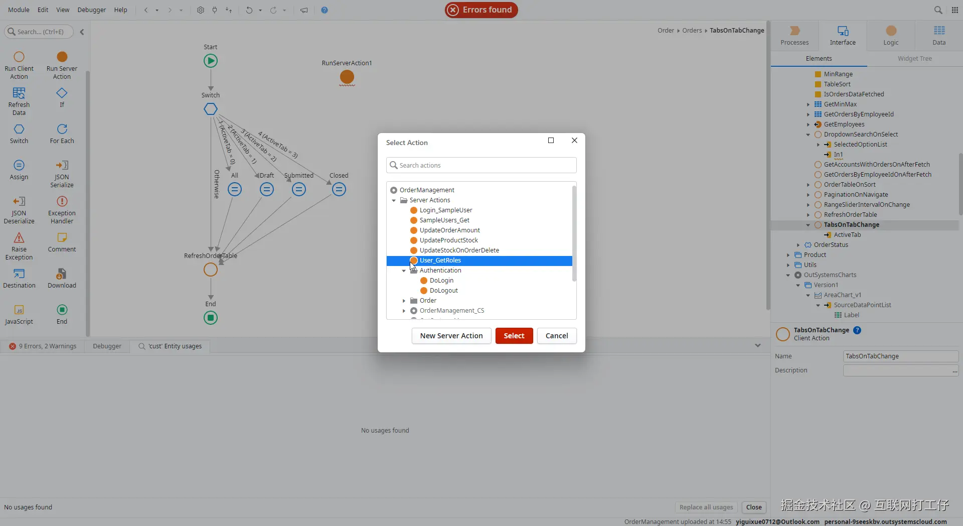 OutSystem 的后台数据逻辑也是集成在 Action 中实现的,通过节点区分为前端 Action 和服务端 Action,这里就不重复介绍。