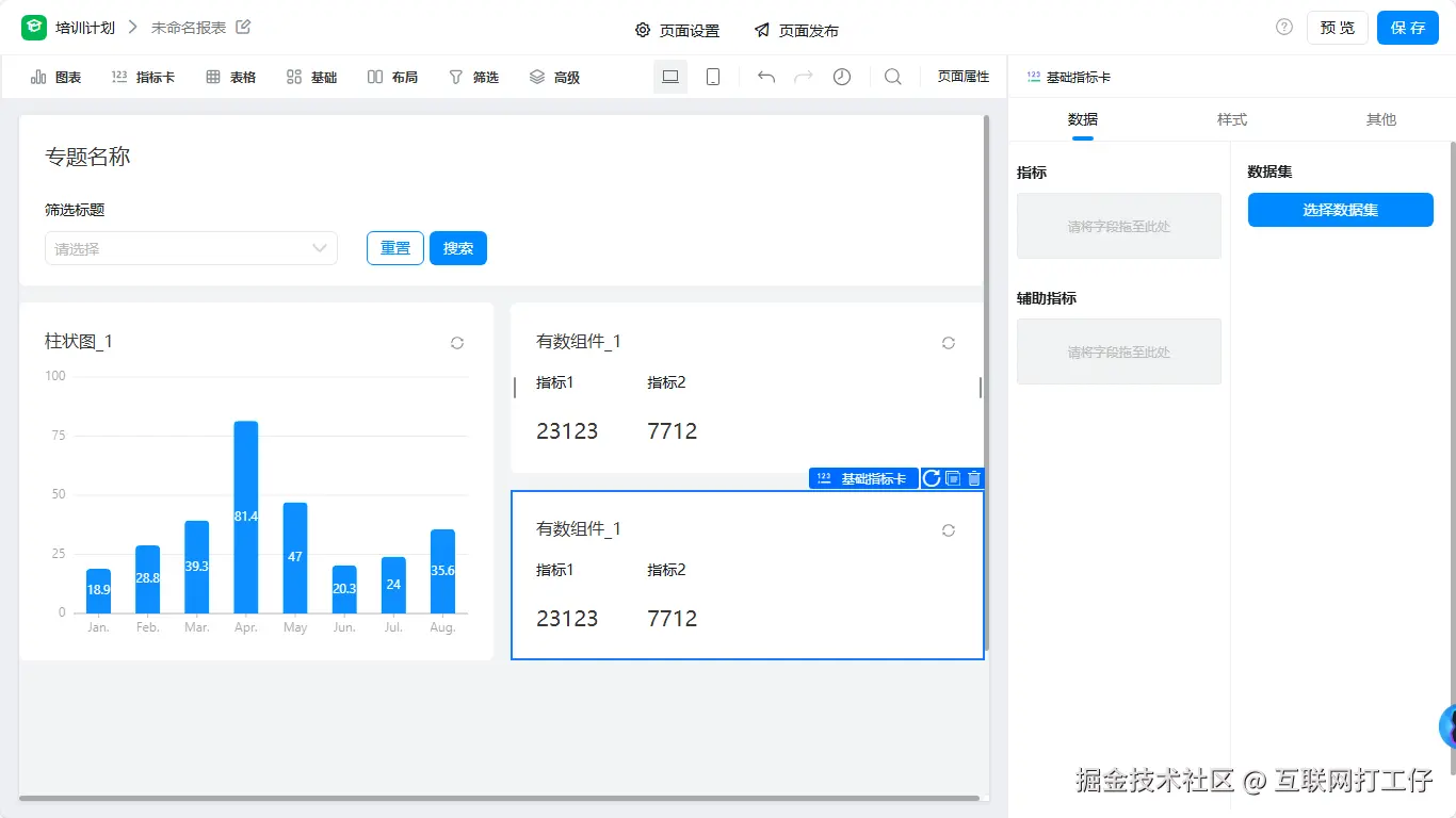 - 仪表盘页面: 通常用于数据统计分析并通过各种图表组件可视化呈现,在仪表盘页面提供了统计图、日历、图片、布局容器等组件,组件可以任意排版布局,也可以针对整个页面设置仪表盘样式