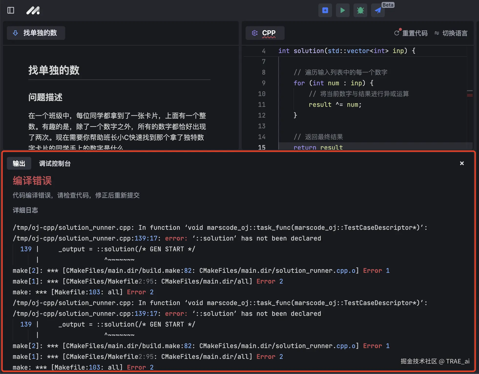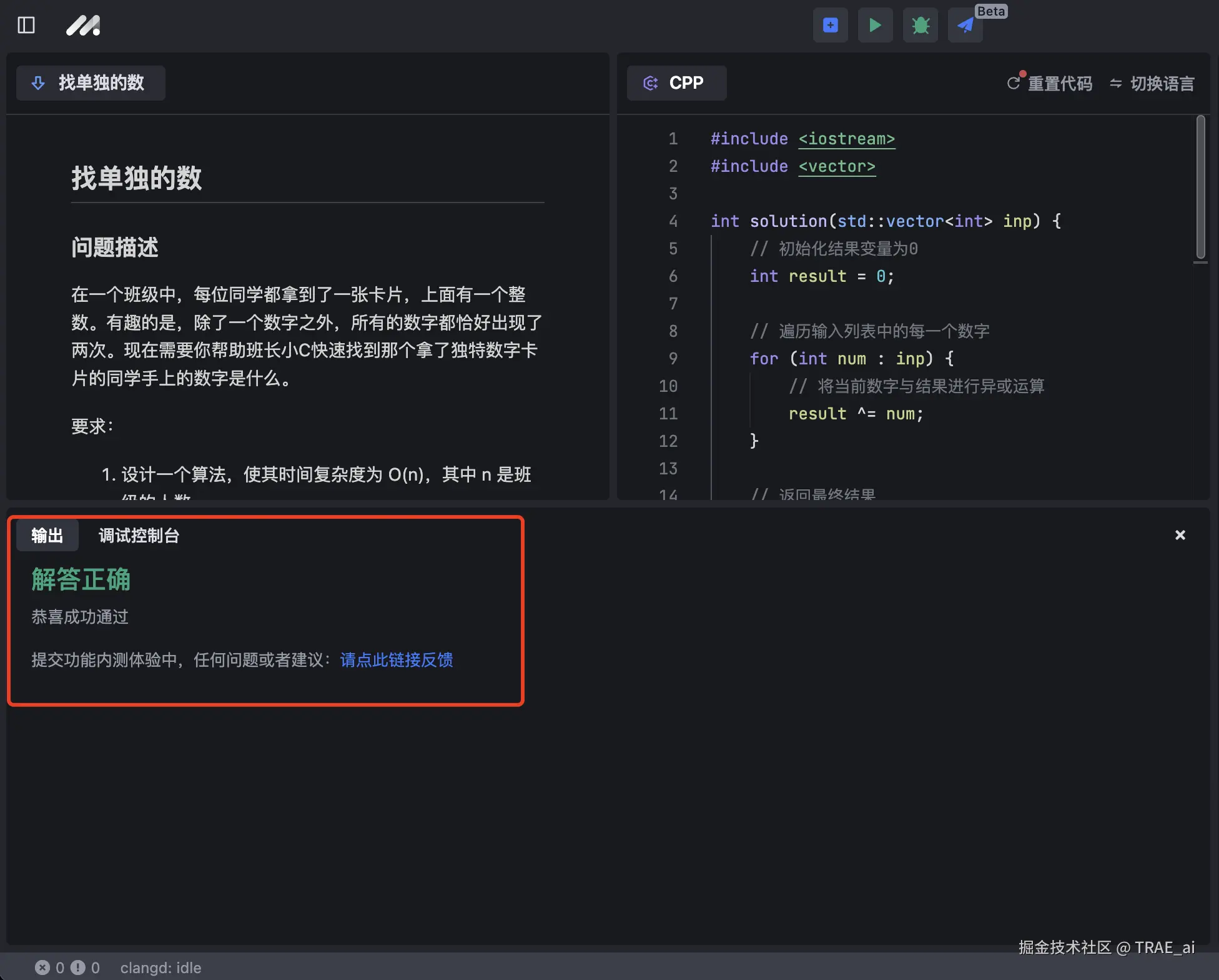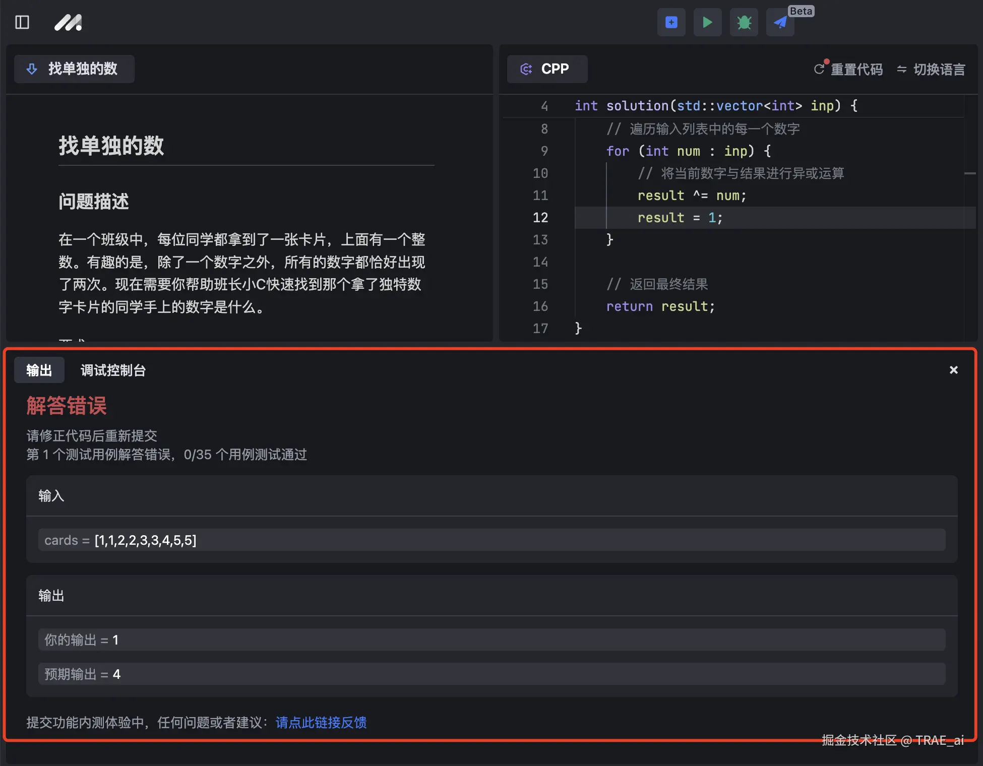 写完 c++ 代码点击提交查看判题结果,现支持 Python/Java/C++,大家期望下一个支持的语言是哪一个呢~