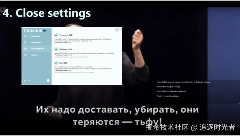 Translumo是一个.NET开源的高级屏幕翻译工具,能够实时检测和翻译选定区域内的文本(如字幕)。Translumo 允许同时组合使用多个 OCR 引擎。它使用机器学习训练模型通过 OCR 对每个识别的结果进行评分,并选择最佳结果。
