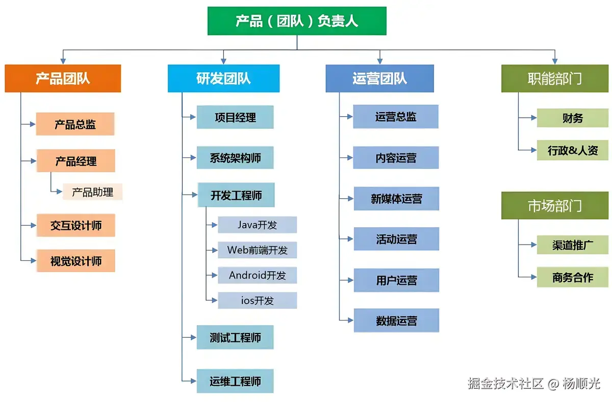 以百人团队举例,服务于一个产品应用或者网页,十五到二十人为一组。有部门经理职一人,组长职若干,组内核心成员若干,组内普通成员若干,一共四个级别,但是下面要涉及到是五类人。