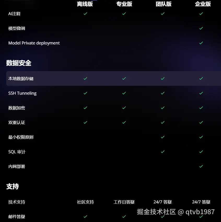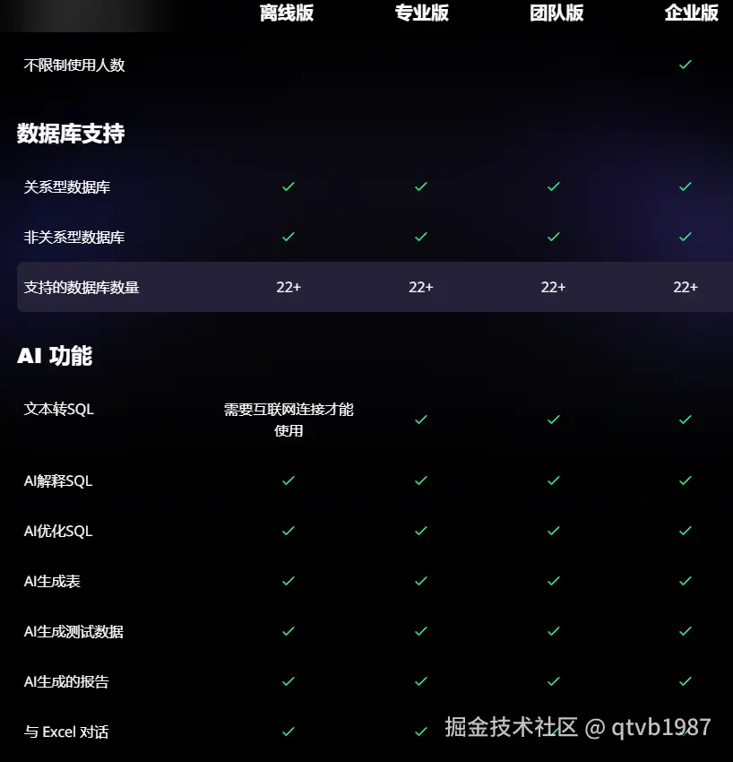 | SQL数据库支持查看全部(opens in a new tab) | 15种 | 全部 | 全部 | 全部 |