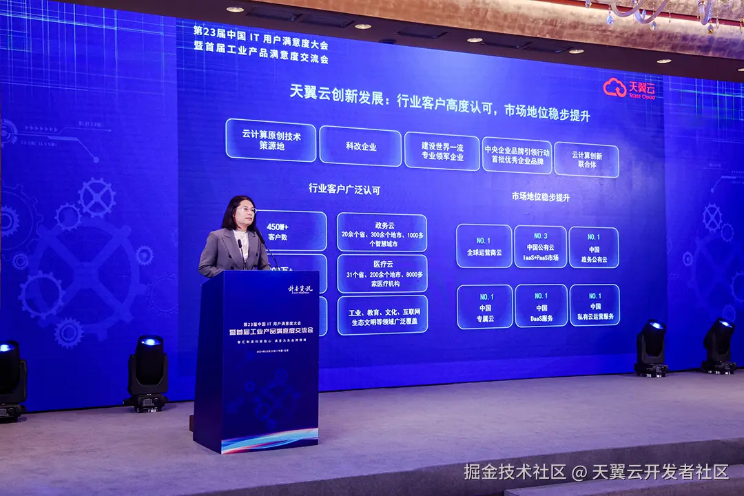 10月25日,2024第23届中国IT用户满意度大会暨首届工业产品满意度交流会在北京举行。现场揭晓“2024中国IT用户满意度征集结果”,天翼云凭借领先的产品技术、完善的客户服务以及在IT行业中的卓越贡献,荣获多项殊荣。其中,天翼云State Cloud云计算品牌、“息壤”一体化智算服务体系、连接保护办公轻量云AOne获评用户满意度第一;云顶大模型营销服一站式解决方案荣获用户首选品牌。会上,天翼云科技有限公司市场营销部总经理王彦丹发表演讲,分享天翼云践行云智一体,实现智算能力全面升级,赋能千行百业高质量发展的创新举措与实践应用。