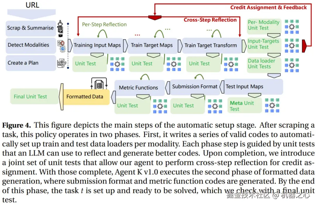 首先,编写一系列有效代码,以自动设置每个模态的训练和测试数据加载器。每个阶段步骤都由单元测试引导,LLM 可以使用这些单元测试来反思和生成更好的代码。之后,引入了一组联合单元测试,让智能体执行跨步骤反思以进行 credit 分配。