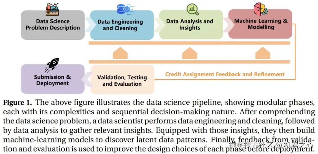 举个例子,在 Kaggle 数据科学竞赛中(如图 1 所示),数据科学家需要遵循一个结构化的工作流程:收集、清理、预处理和标准化数据,创建数据加载器以实现高效管理,生成关键评估指标,以及开发自定义模型。然后,这些见解和预测可以为决策和优化提供信息。因此,为了解决这些工作流程,需要数据科学智能体将任务分解为子问题并与各种子系统交互以实现指定目标。