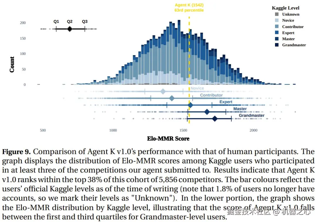 此外,他们还测量了 Agent K v1.0 与人类参与者的 Elo-MMR 评分。结果表明,在由 5856 名参赛者组成的竞赛池中,Agent K v1.0 排名前 38%。
