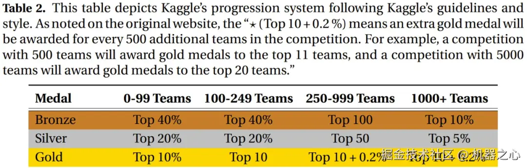 下表则是基于 Kaggle 的指南和风格构建的 Kaggle 进展系统。⋆ (Top 10 + 0.2 %) 是指竞赛每增加 500 个参赛队伍,就会额外给出一枚金牌。举个例子,如果一个竞赛有 500 个参赛队伍,则会给 11 团队授予金牌。而如果竞赛队伍有 5000 个,则金牌数会达到 20。
