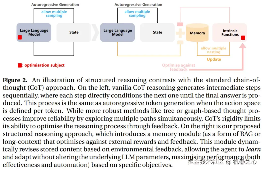 右侧是新提出的结构化推理方法,它引入了一个记忆模块(作为 RAG 或长上下文的一种形式),可以根据外部奖励和反馈进行优化。该模块可根据环境反馈动态地修改存储的内容,让智能体可在不改变底层 LLM 参数的情况下学习和适应,进而根据具体目标最大限度地提高性能(有效性和自动化)。