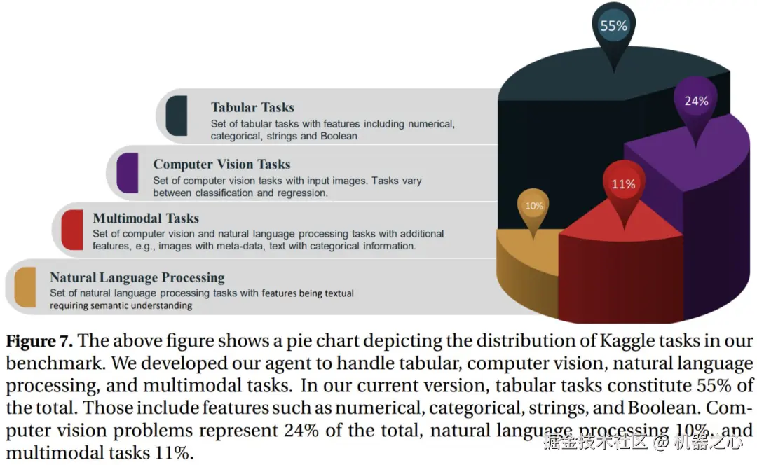 下图展示了该基准中 Kaggle 任务的分布情况。目前,其中 55% 是表格任务,包括数值、类别、字符串和布尔值表。另外计算机视觉站 24%,自然语言处理占 10%、多模态任务占 11%。