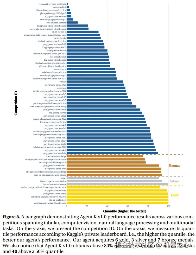 在性能方面,在多模态挑战赛中,该团队的方法实现了相当于 6 金 3 银 7 铜的成绩(共 65 场竞赛),成为了首个达到 Kaggle Grandmaster level 1 水平的方法。下图展示了 Agent K v1.0 在各个任务上的性能表现。