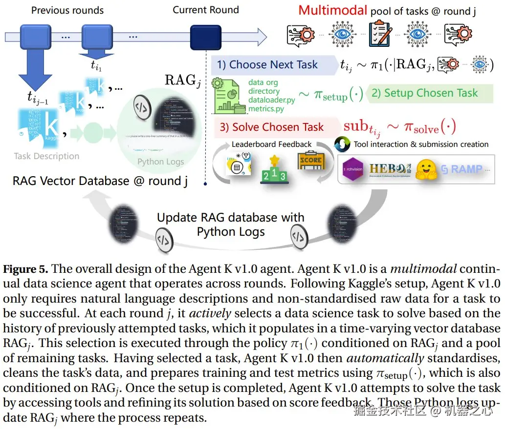 按照 Kaggle 的设置,Agent K v1.0 只需要自然语言描述和非标准化原始数据即可成功完成任务。在每一轮 j 中,它会根据之前尝试过的任务的历史记录主动选择要解决的数据科学任务,并将其填充到随时间变化的向量数据库 RAG_j 中。这种选择是策略 π_1 (・) 基于 RAG_j 和一个剩余任务池执行的。