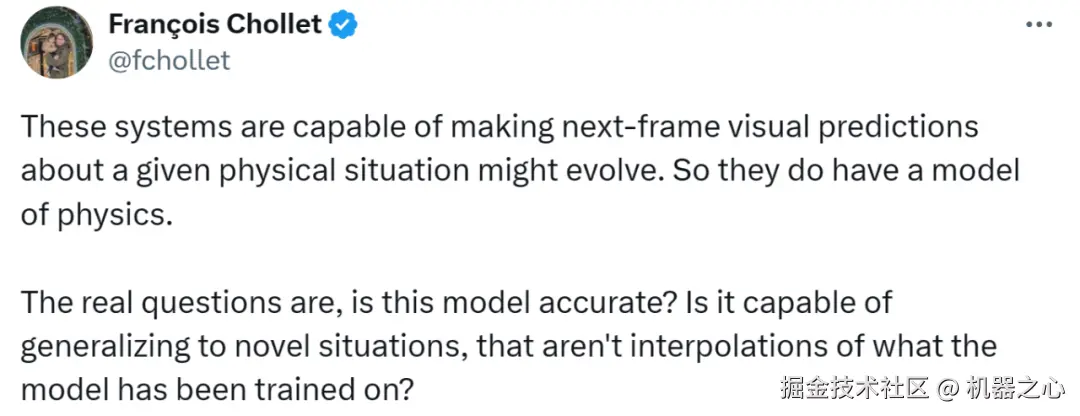 Keras 之父 François Chollet 则认为,Sora 这样的视频生成模型确实嵌入了「物理模型」,但问题是:这个物理模型是否准确?它能否泛化到新的情况,即那些不仅仅是训练数据插值的情形?这些问题至关重要,决定了生成图像的应用范围 —— 是仅限于媒体生产,还是可以用作现实世界的可靠模拟。最后他指出,不能简单地通过拟合大量数据来期望得到一个能够泛化到现实世界所有可能情况的模型。