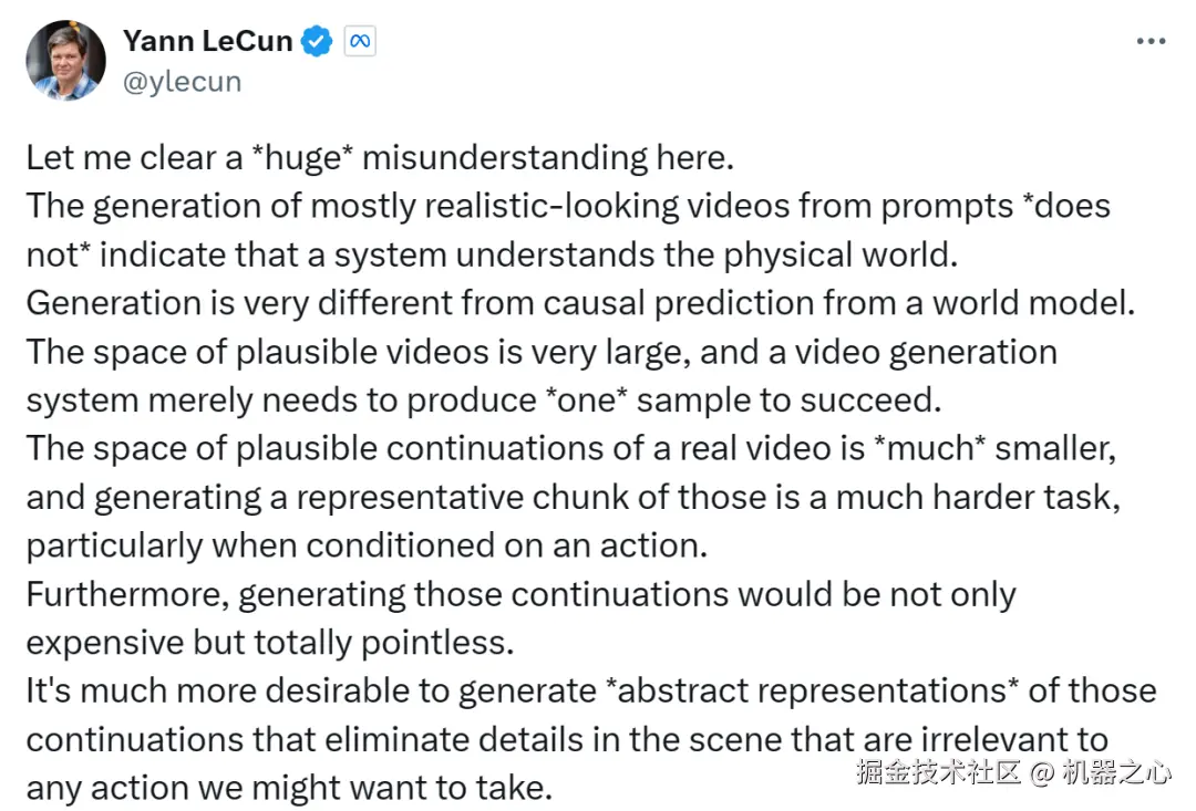 自从 Sora 横空出世,业界便掀起了一场「视频生成模型到底懂不懂物理规律」的争论。图灵奖得主 Yann LeCun 明确表示,基于文本提示生成的逼真视频并不代表模型真正理解了物理世界。之后更是直言,像 Sora 这样通过生成像素来建模世界的方式注定要失败。