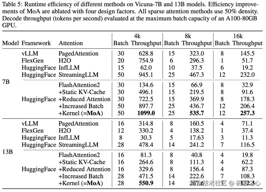 下表比较了 MoA 相对于各种注意力机制和 LLM 框架的运行效率,并对 MoA 的每个设计带来的效率提升进行了消融分析。在 50% 注意力密度下,MoA 相比 FlashAttention2 将解码吞吐量提升了 6.6-8.2 倍。相比 H2O 和 InfLLM,解码吞吐量提升了 1.2-4.0 倍。与包含高度系统级优化的 vLLM 框架 [11] 相比,MoA 仍实现了 1.7-1.9 倍的吞吐量提升。MoA 还将 GPU 总内存减少 1.2 到 1.4 倍。
