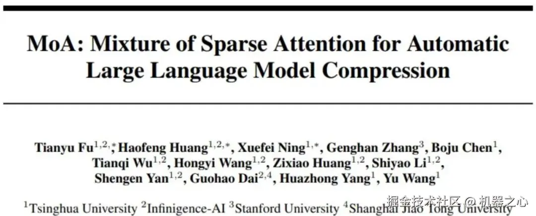 最近,来自清华大学、无问芯穹和上海交通大学的研究团队发表了《MoA: Mixture of Sparse Attention for Automatic Large Language Model Compression》,提出通过混合不同稀疏度的注意力头,使用 25% 的注意力稠密度,就可以记忆几乎 100% 的上下文。