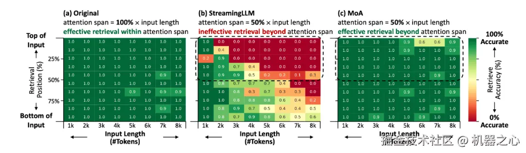 在 LongEval 数据集上 [7],使用不同注意力方法的 Vicuna-7B 模型在不同输入长度和检索位置的检索精度。大海捞针实验[8] 将大量的键值对作为输入,并在不同位置测试给键检索值时的精度。(a) 原始稠密注意力模型;(b)统一跨度滑窗 StreamingLLM,注意力跨度减半,超出跨度时检索效果降低;(c) MoA,平均注意力跨度减半,超出跨度时检索效果依然优秀。