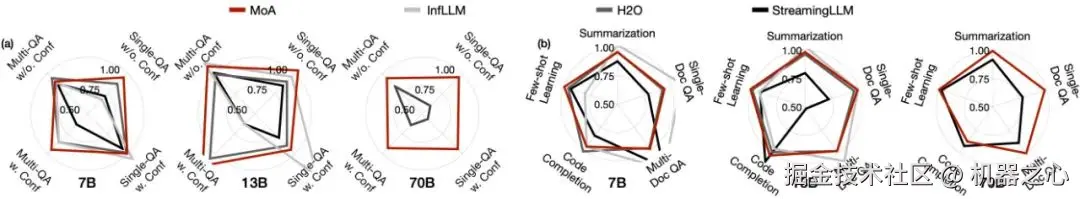 对于长上下文理解任务,在使用 LV-Eval 和 LongBench 的基准测试中,MoA 只显示了最大 5% 和 3% 的相对分数下降,而 StreamingLLM 则分别最大下降了 36% 和 27%;InfLLM 最大下降了 17% 和 5%;H2O 最大下降了 9% 和 4%