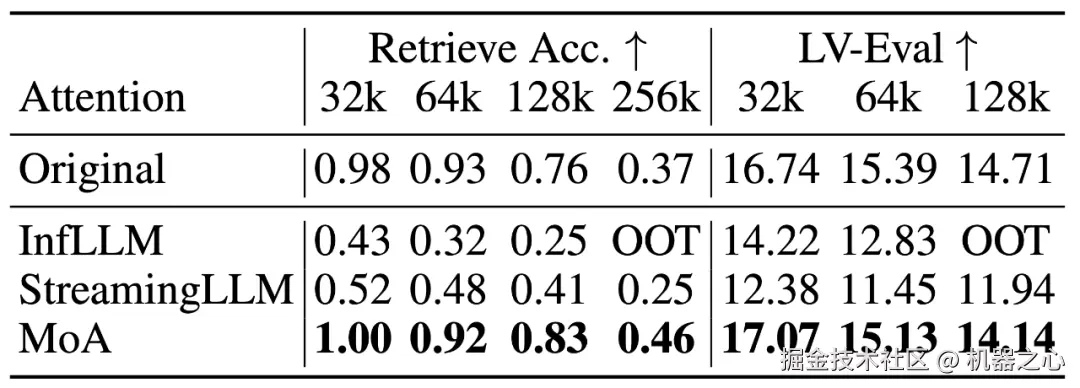 长上下文泛化。通过在 12k 长度内进行压缩,MoA 能够有效泛化到 32k-256k 的长度。如下表所示,在范化的长度上,MoA 的检索精度比 InfLLM 和 StreamingLLM 高 1.9-3.3 倍,LV-Eval 评分高 1.2-1.4 倍,展现出与原始稠密模型相当的性能。如下表所示,