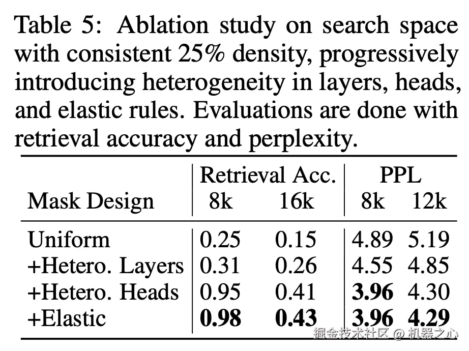 消融实验进一步评估了不同程度的稀疏注意力混合对于最终性能的影响。从基本的统一跨度滑窗开始,通过依次引入不同程度的异质性(层间,注意力头间,输入长度间),最终模型性能在不断提升。