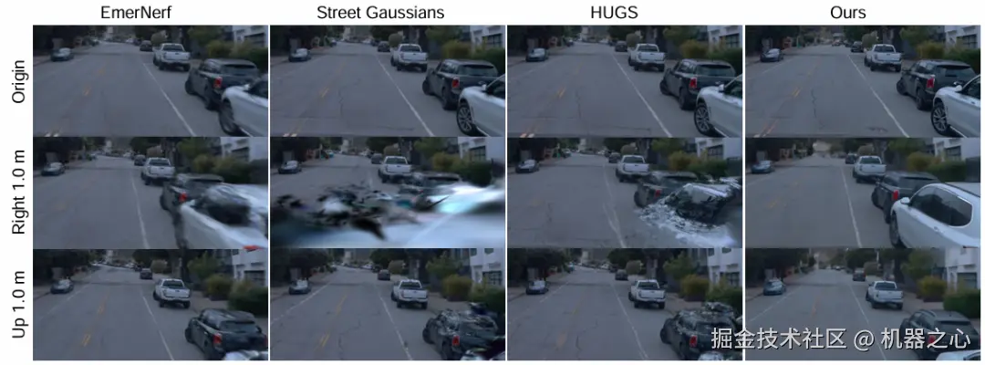 与前有重建方法在原训练视角、训练视角右一米、训练视角上一米的视角合成效果对比。