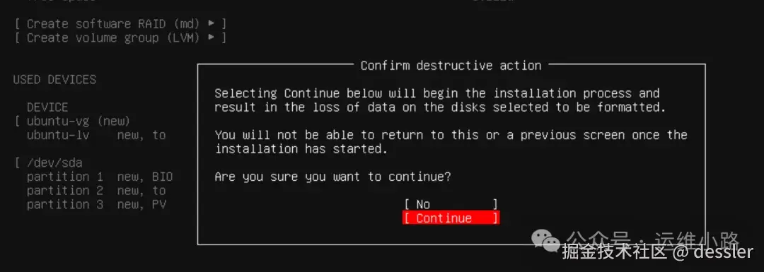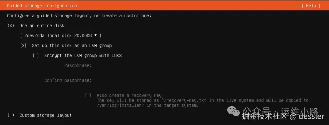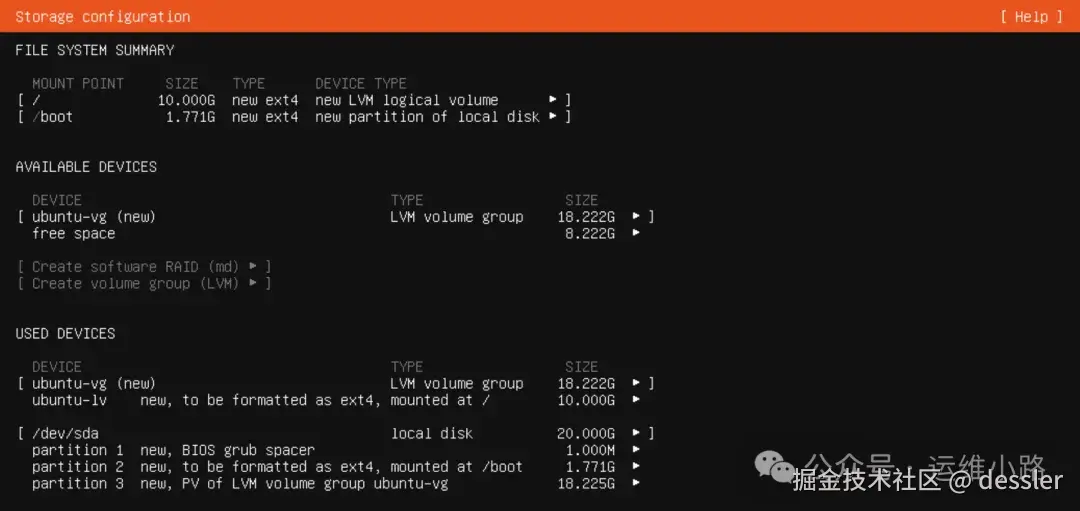 这里也和centos配置是一样的,默认是lvm,我们不熟悉都默认即可。只是没centos的图形配置方便。