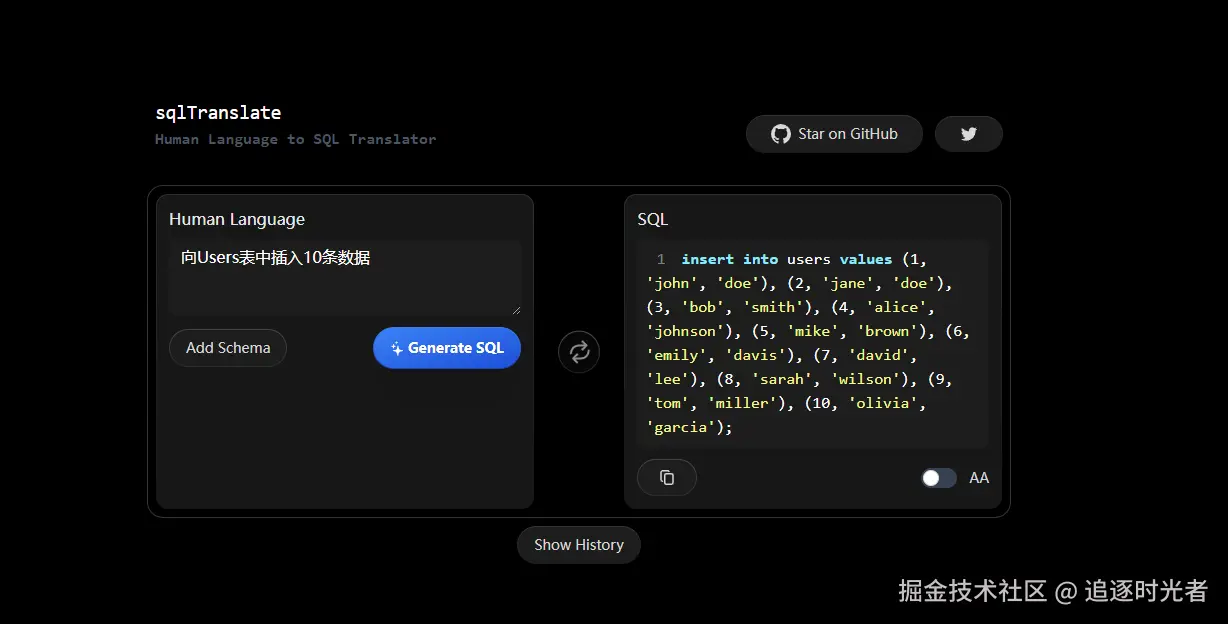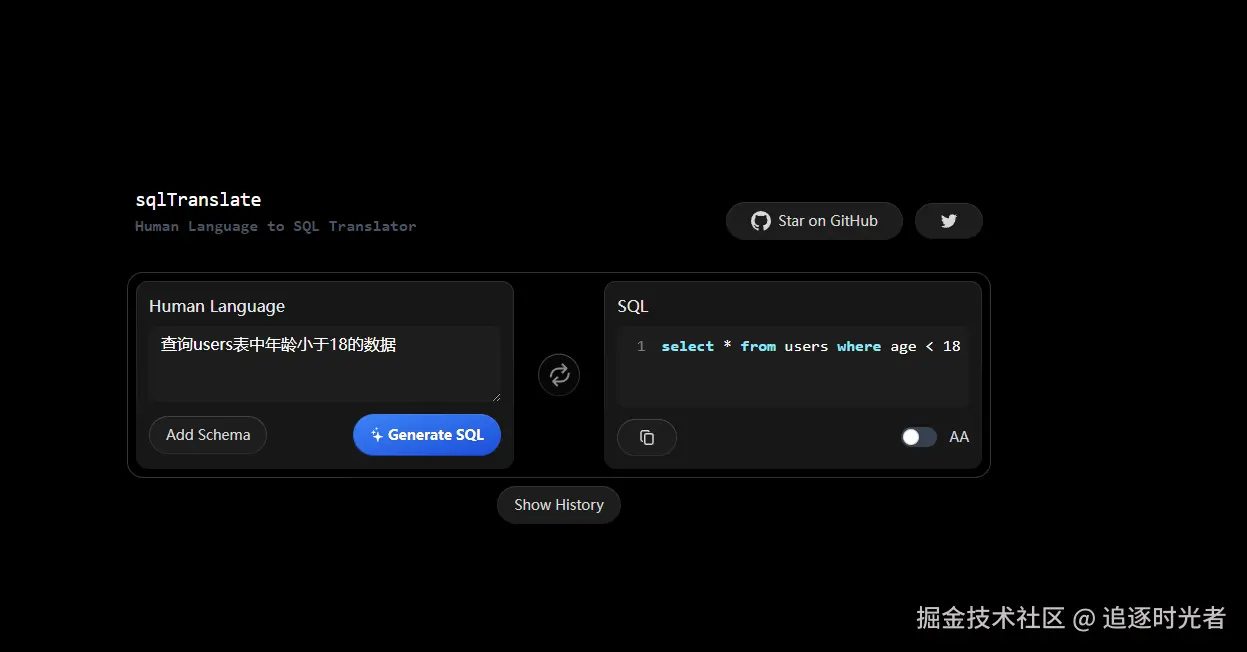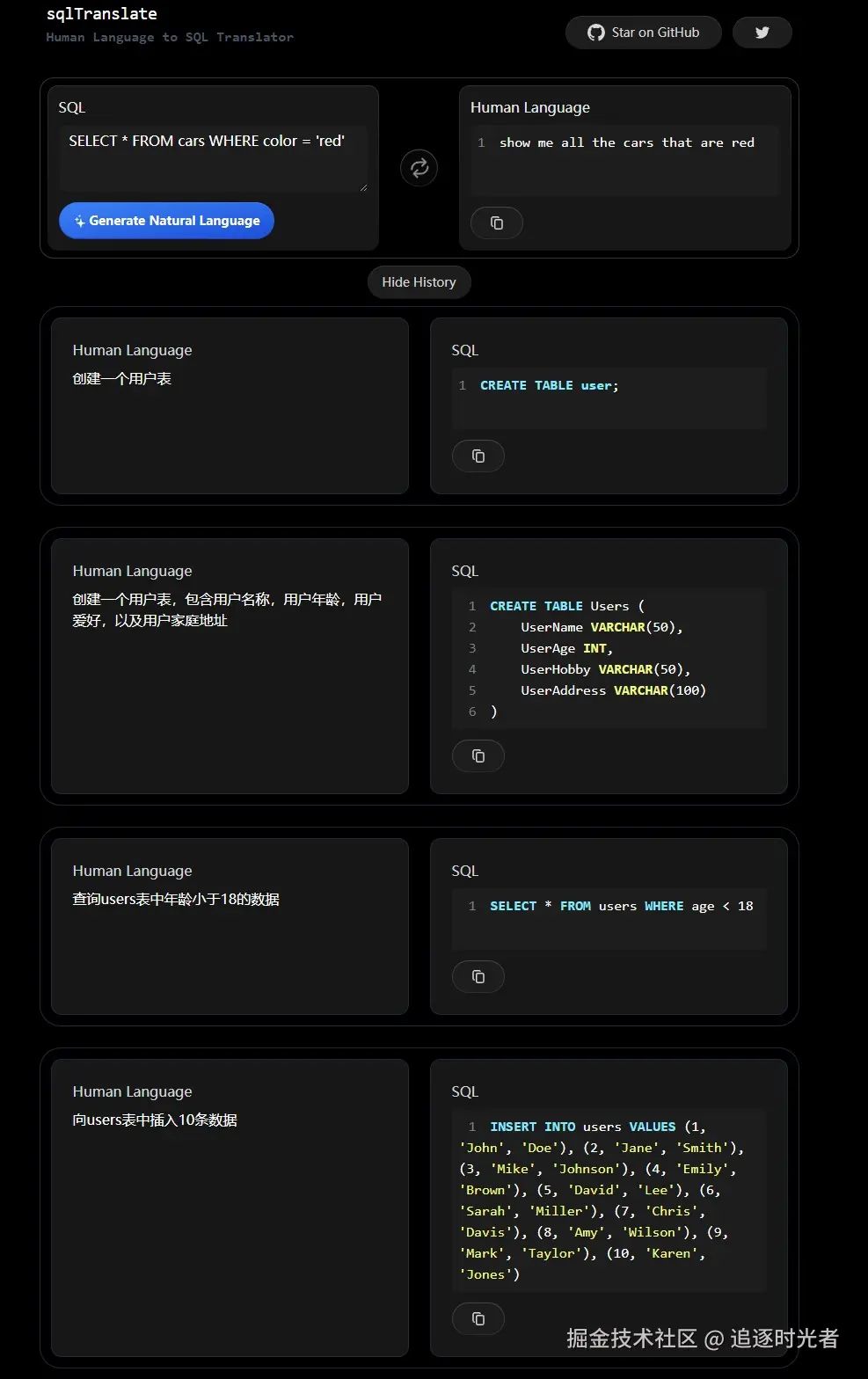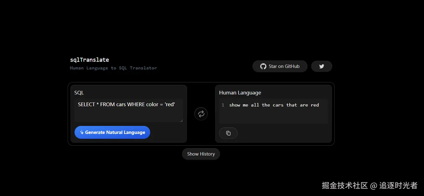 SQL Translator是一款利用人工智能将自然语言查询转换为 SQL 代码的互译工具,它的主要目的是简化SQL查询的编写过程,让非专业的SQL用户、数据库管理员、数据分析师等能够以自然语言的形式输入查询,然后快速获得对应的SQL代码。此外,用户还可以将已有的SQL代码输入,获取易于理解的自然语言翻译,从而更直观地理解SQL代码的含义。