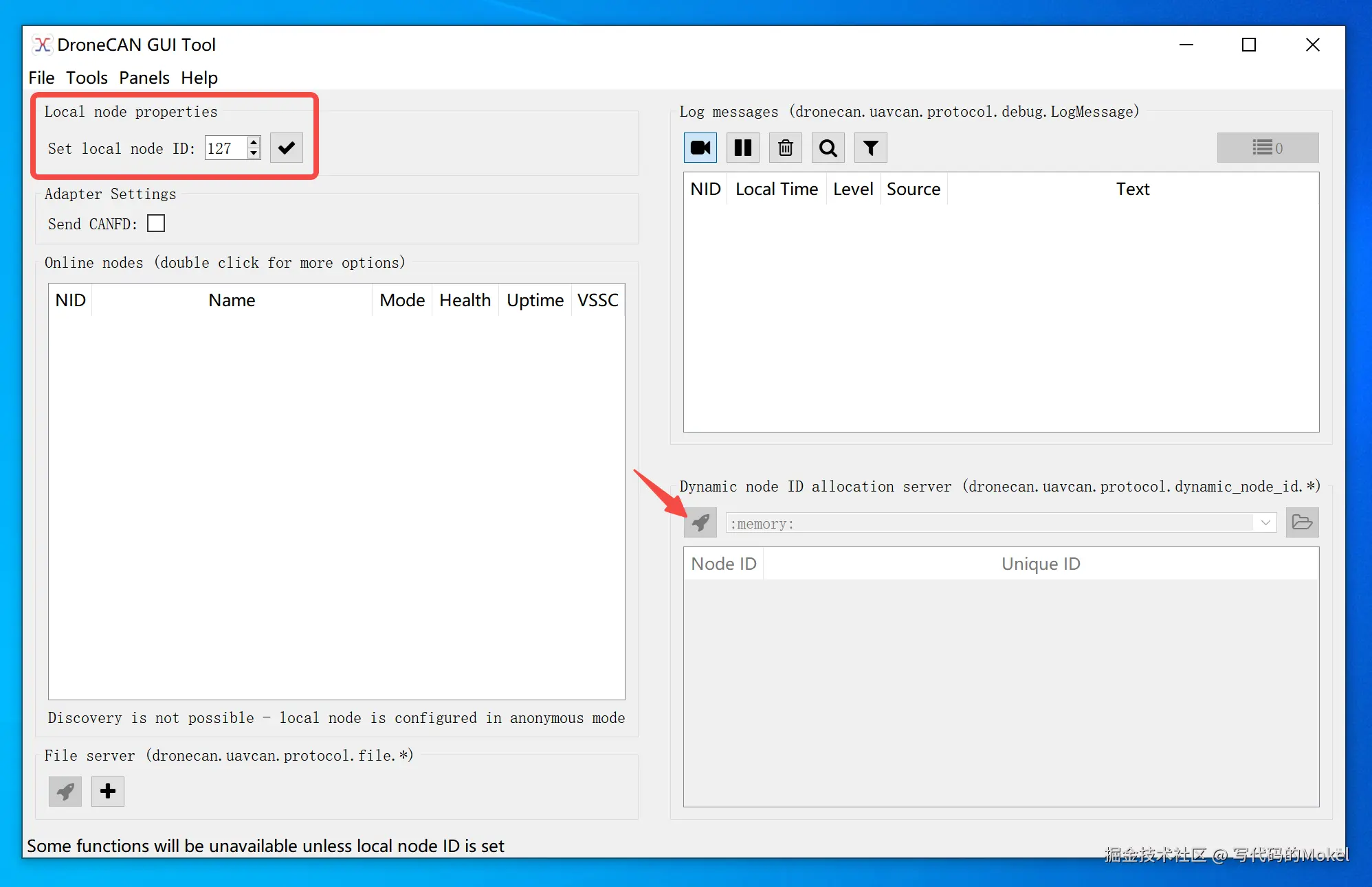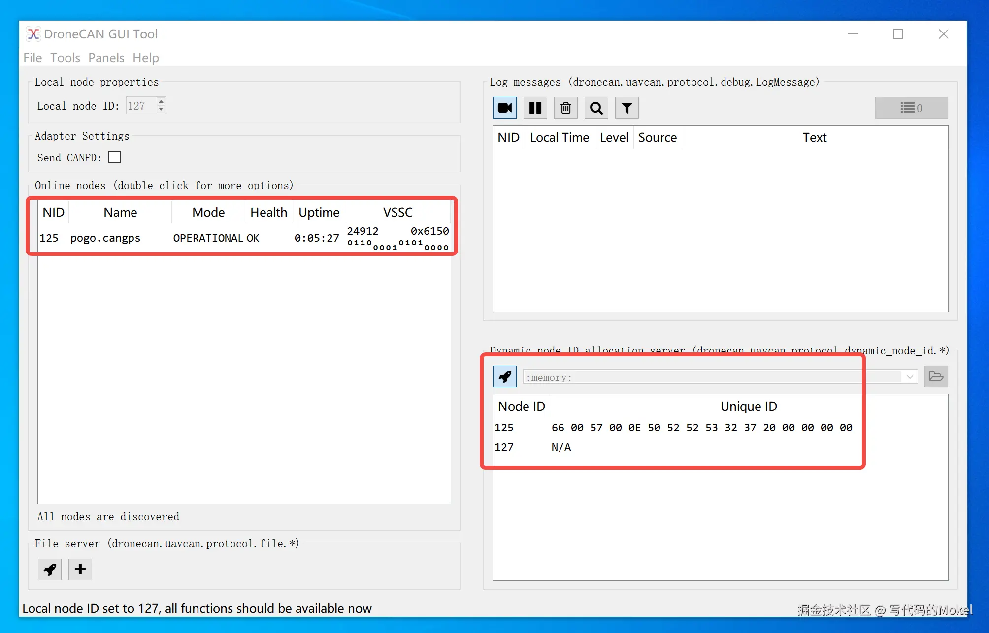 在电脑上打开DroneCAN_GUI_Tool上位机,选择STM...Virtual COM Port 或 USB串行设备(COMx),点击OK进入上位机,然后依次在左上角设置local NodeID,在右下角点击小火箭icon(该操作的作用是给连接到DroneCAN调试器的DroneCAN外设,比如这里的DroneCANGNSS模块,自动分配DroneCAN NodeID),可以看到识别到了Pogo-DroneCANGNSS节点(pogo.cangps)。