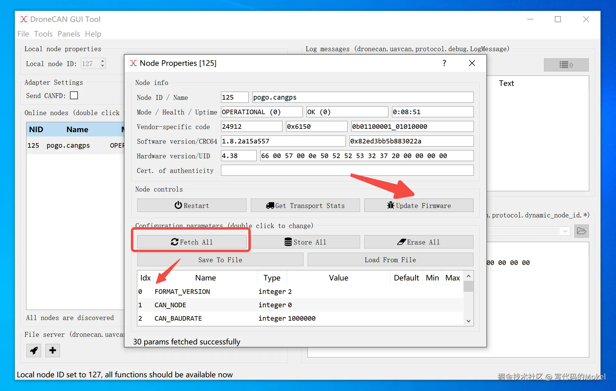 双击该Pogo-DroneCANGNSS节点(pogo.cangps),DroneCAN_GUI_Tool为会该节点打开一个Node属性界面,你可以该界面点击FetchAll查看和修改DroneCANGNSS模块的所有参数,也可以点击Update Firmware更新该GNSS模块的固件。Pogo智能科技的这款DroneCANGNSS模块目前不需要修改任何参数。