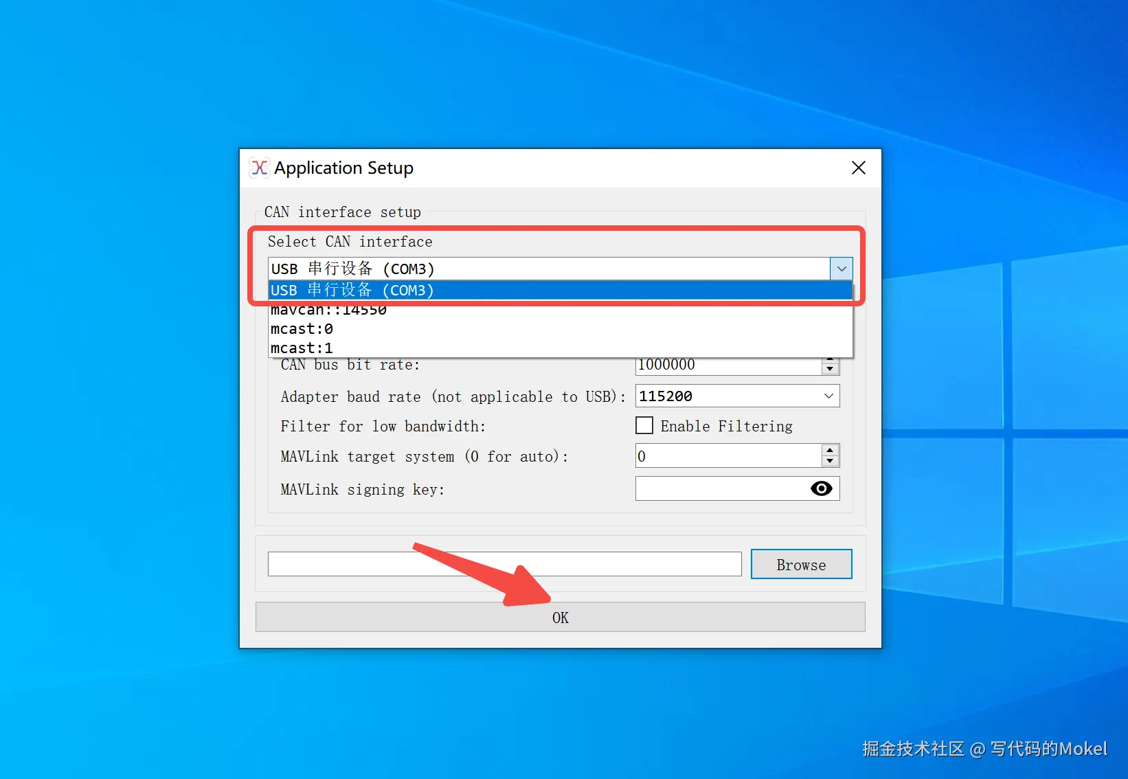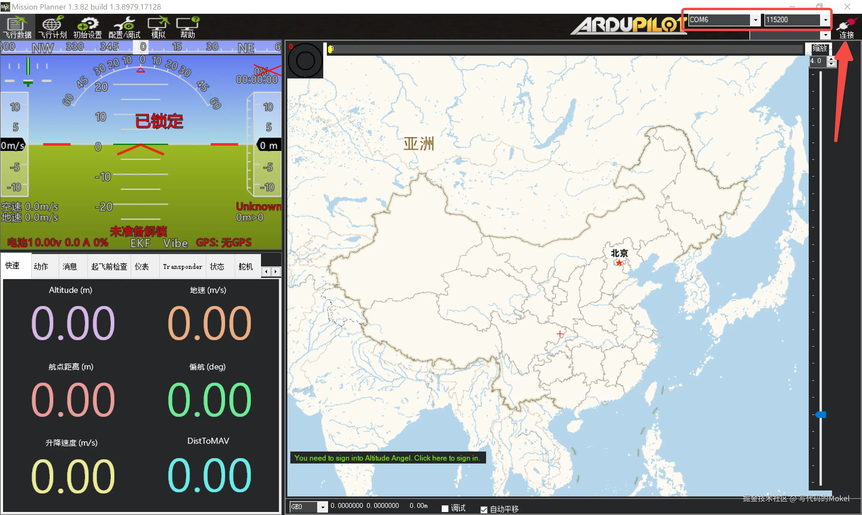 将Pogo-DroneCAN GNSS模块连接到飞控的CAN1口,需要注意的是,请确保你的飞控已经开启了CAN总线支持和已经设置通讯协议为DroneCAN,如果你不确定你的飞控是否完成了设置,你可以查看 这篇文章(开启Ardupilot/Pixhawk的CAN总线支持和设置通讯协议为DroneCAN/UAVCAN)来检查你的飞控,然后用typeC线将飞控连接到电脑,打开Mission Planner,选择对应的COM端口和波特率,点击连接,等待MP与飞控完成连接。