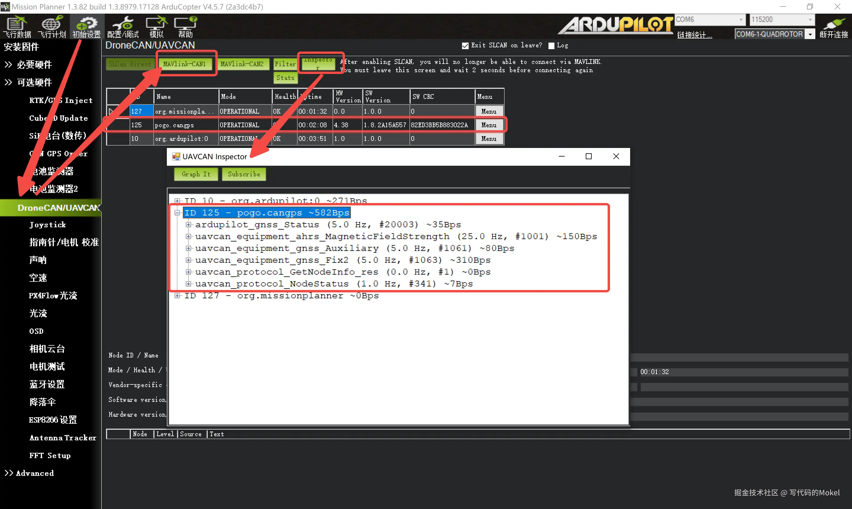 重新连接好后,切换到 初始设置 -> 可选硬件 -> DroneCAN/UAVCAN,点击MAVlink-CAN1,界面会显示当前系统中的DroneCAN节点,在这里一共有3个,分别是 127节点MP地面站,10节点飞控本体,125节点Pogo-DroneCAN GNSS模块(pogo.cangps),然后点击最右侧的 Inspector 弹出 UAVCAN Inspector,这里显示了每个节点向CAN总线上发出的DroneCAN数据分别是哪些,在这里可以看到 125节点pogo.cangps 对外发出了多种不同的DroneCAN数据。