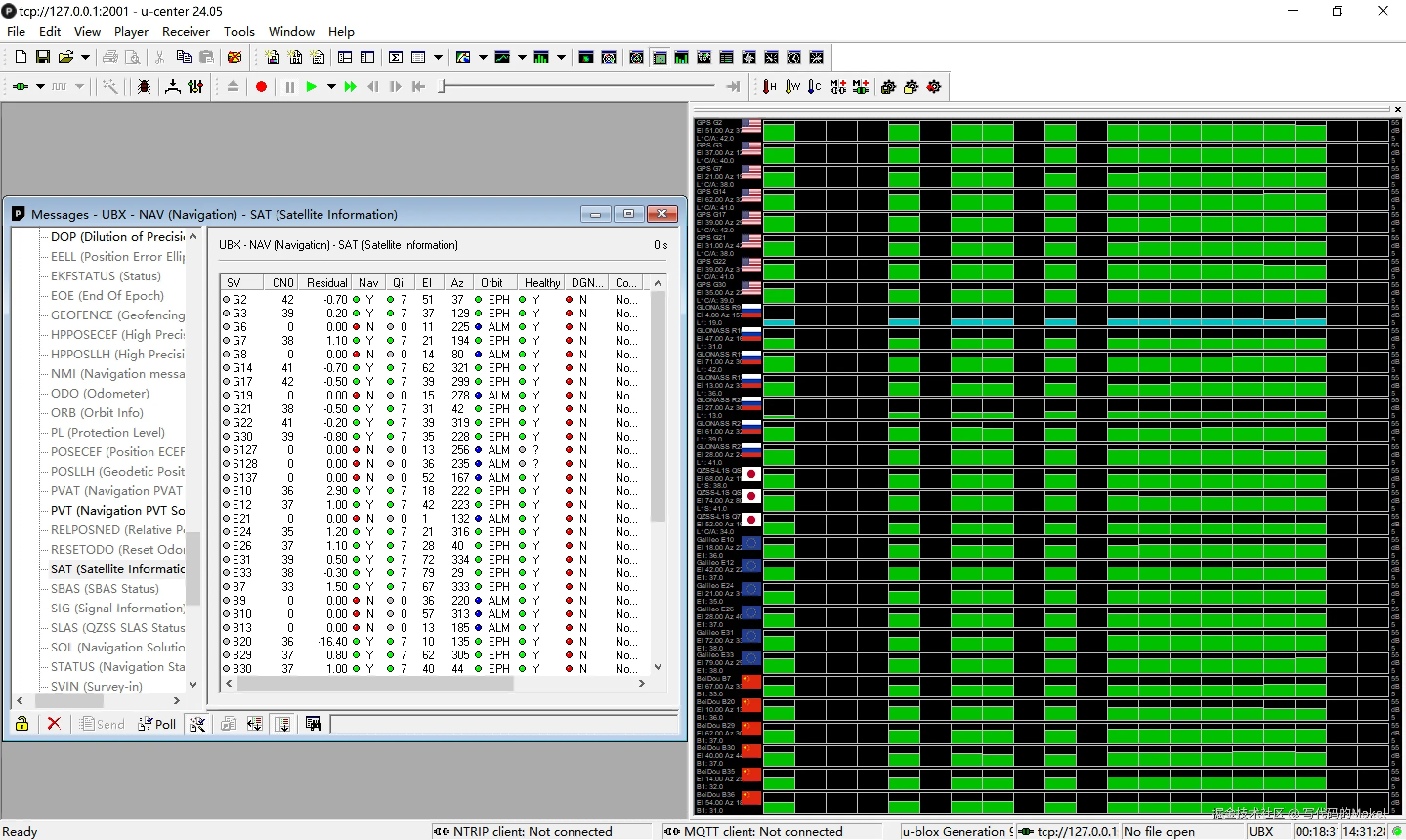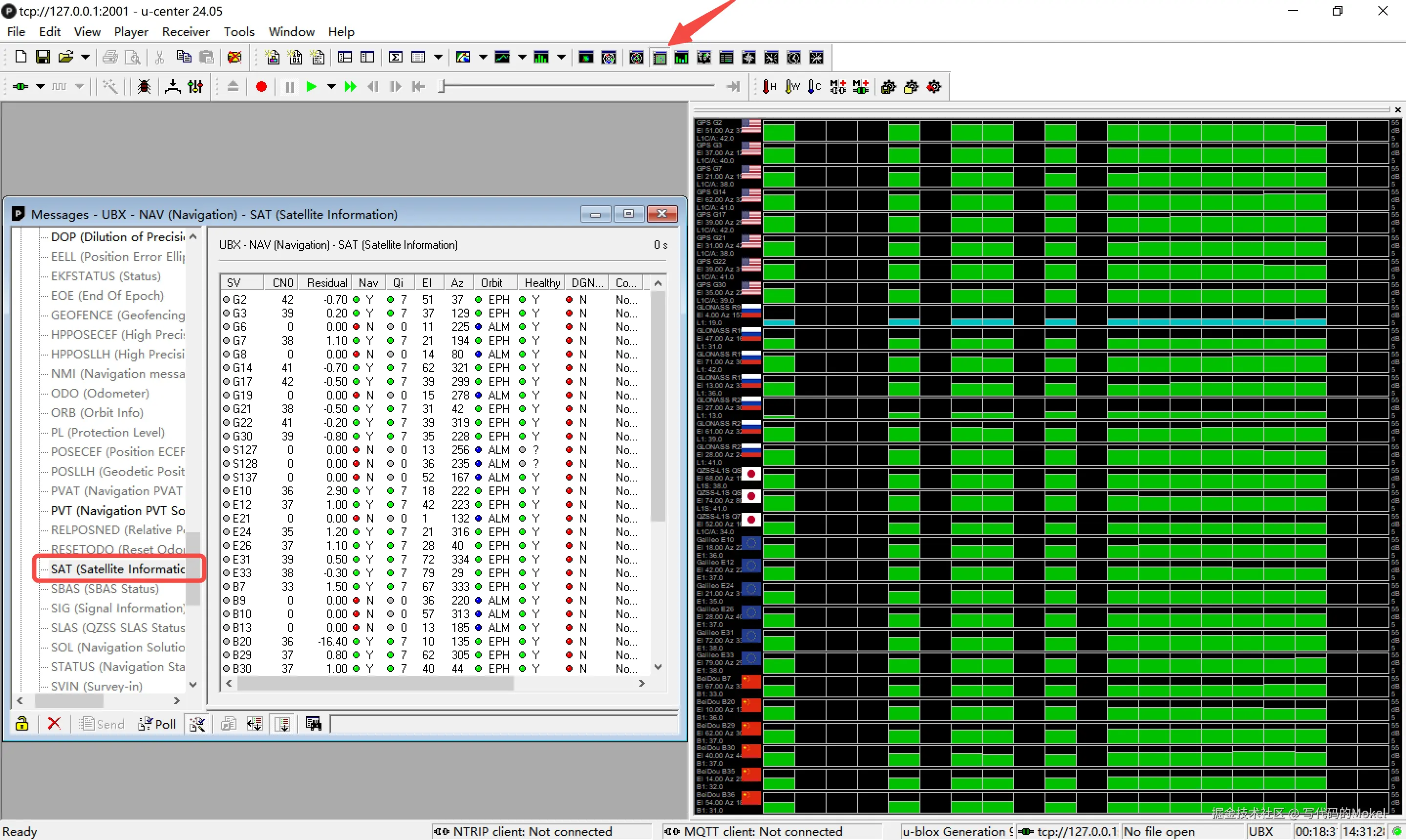 此外,我们还可以先通过右上侧的快捷按钮打开卫星列表,然后双击左侧的SAT(Satellite Information,卫星信息)或者右键点击 SAT 后选择 Poll Message 或 Enable Message,就可以将卫星列表展示在页面里。