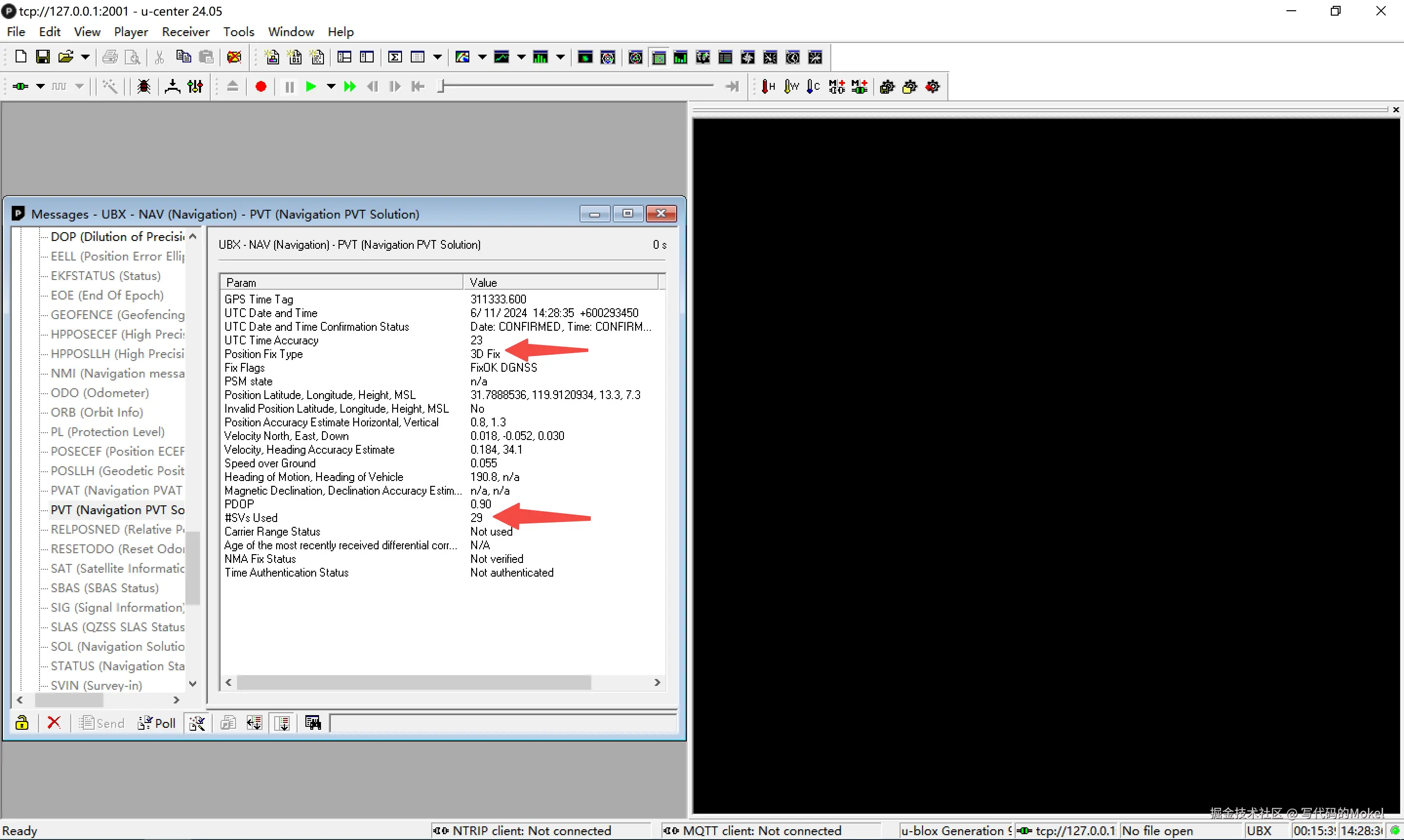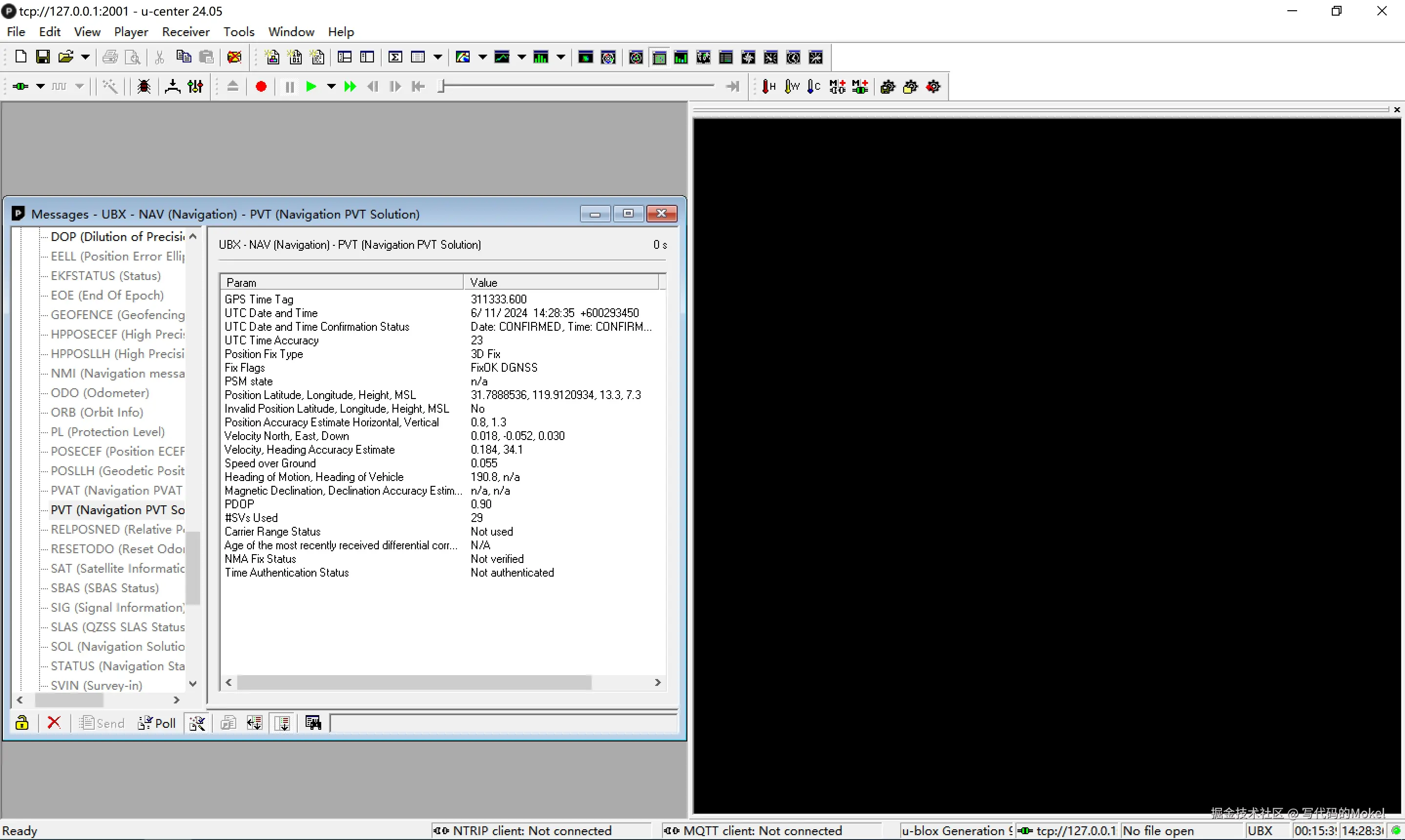 然后点击 View -> Messages View,在弹出的 Messages 框里点击 UBX -> NAV -> PVT,我们可以查看当前卫星定位情况,其中 Position Fix Type 和 Svs Used 与我们在DroneCAN_GUI_Tool -> CAN bus monitor 界面关注的两个数据是一致的。