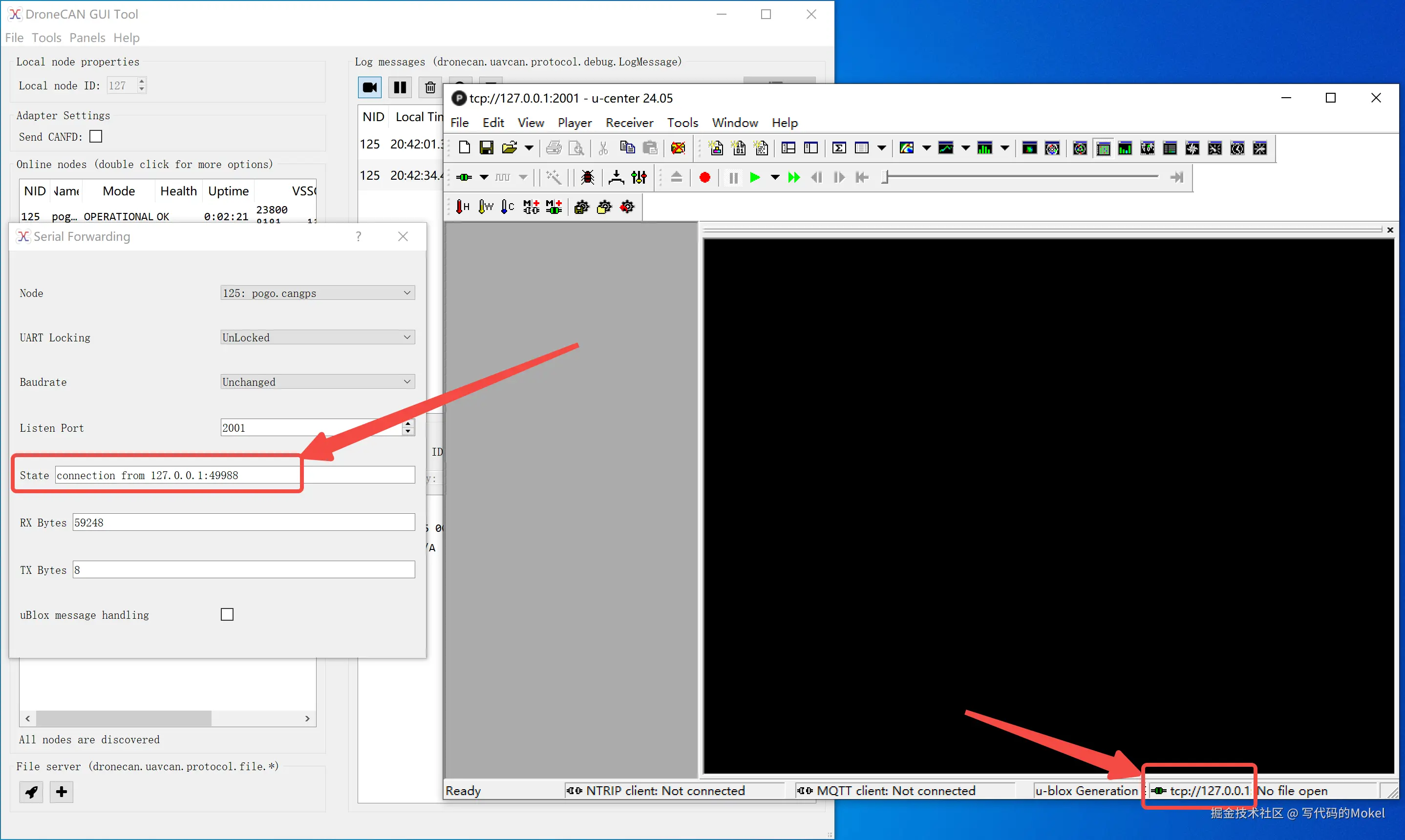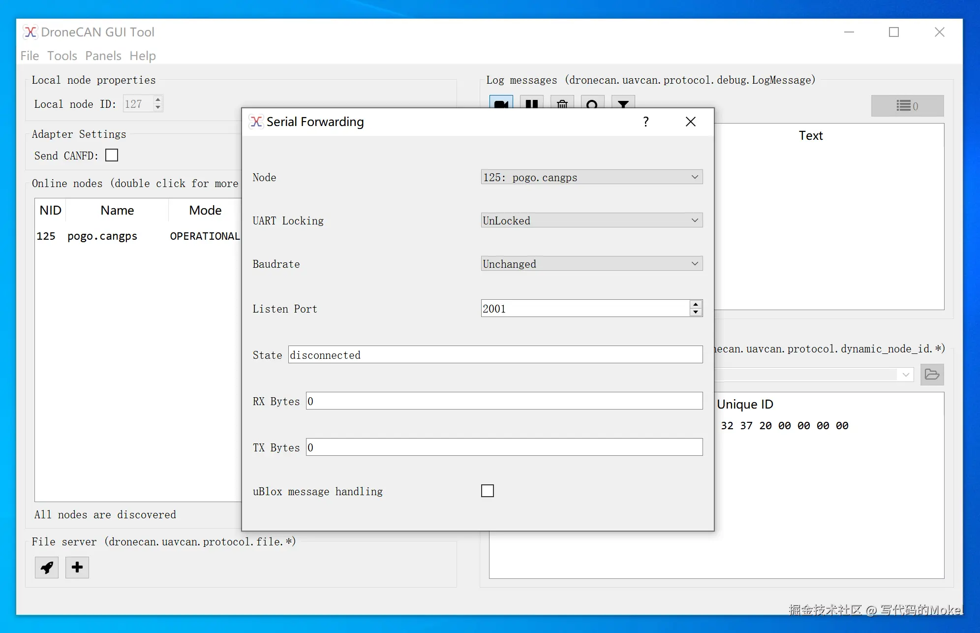 通过DroneCAN_GUI_Tool的Serial forwarding让u-center与Pogo-DroneCANGNSS建立连接