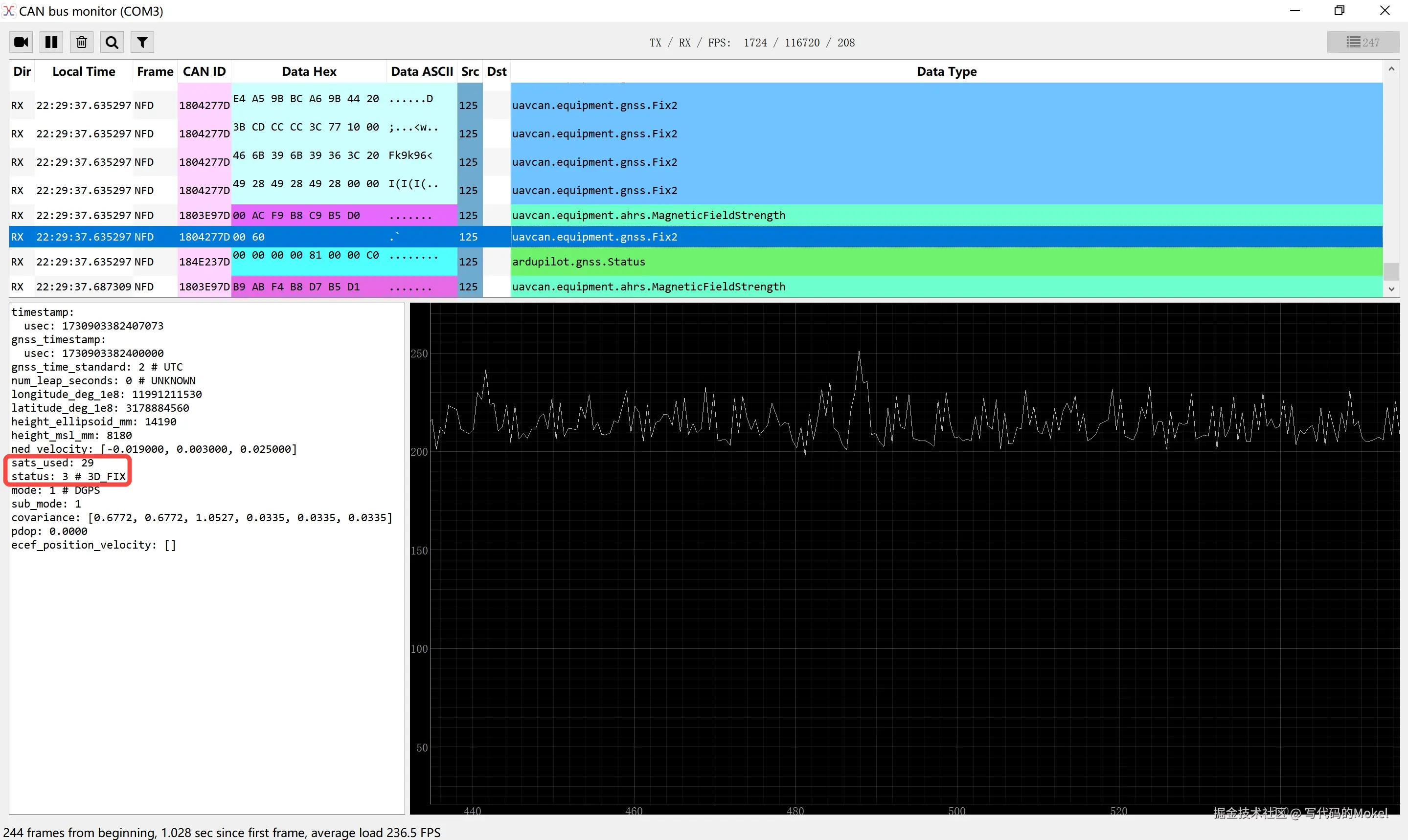 关闭Node属性界面,在Tools -> Bus Monitor 打开 CAN bus monitor(COMx)界面,点击该界面左上角的摄像头icon,可以看到上位机收到了Pogo-DroneCANGNSS模块发送的数据,其中有节点状态数据uavcan.protocol.NodeStatus,磁力计数据uavcan.equipment.ahrs.MagneticFieldStrength,gnss状态数据ardupilot.gnss.Status,卫星定位数据uavcan.equipment.gnss.Fix2等。我们主要查看卫星定位数据uavcan.equipment.gnss.Fix2,可以看到卫星定位数据显示我们当前定位状态为3D_FIX,卫星数量为29颗,其他数据大家可自行研究。